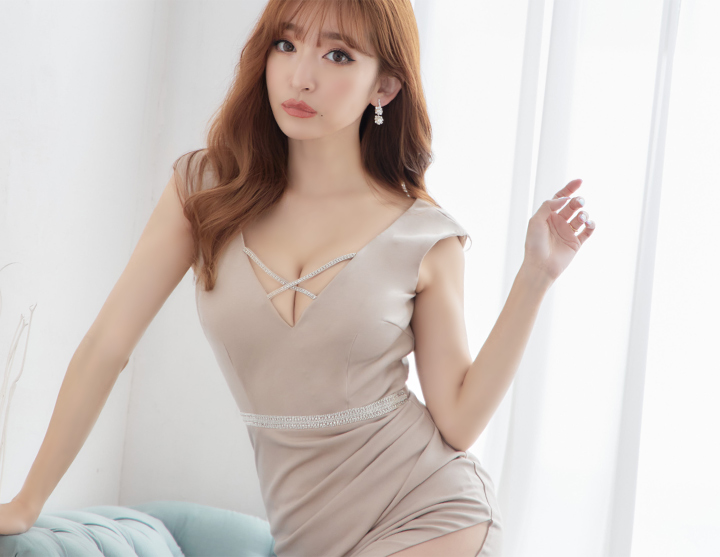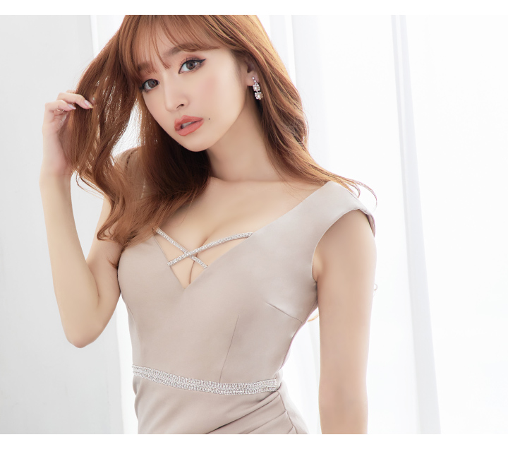 杉山佳那恵着用キャバドレス。胸元にクロスされたビシューが印象的。