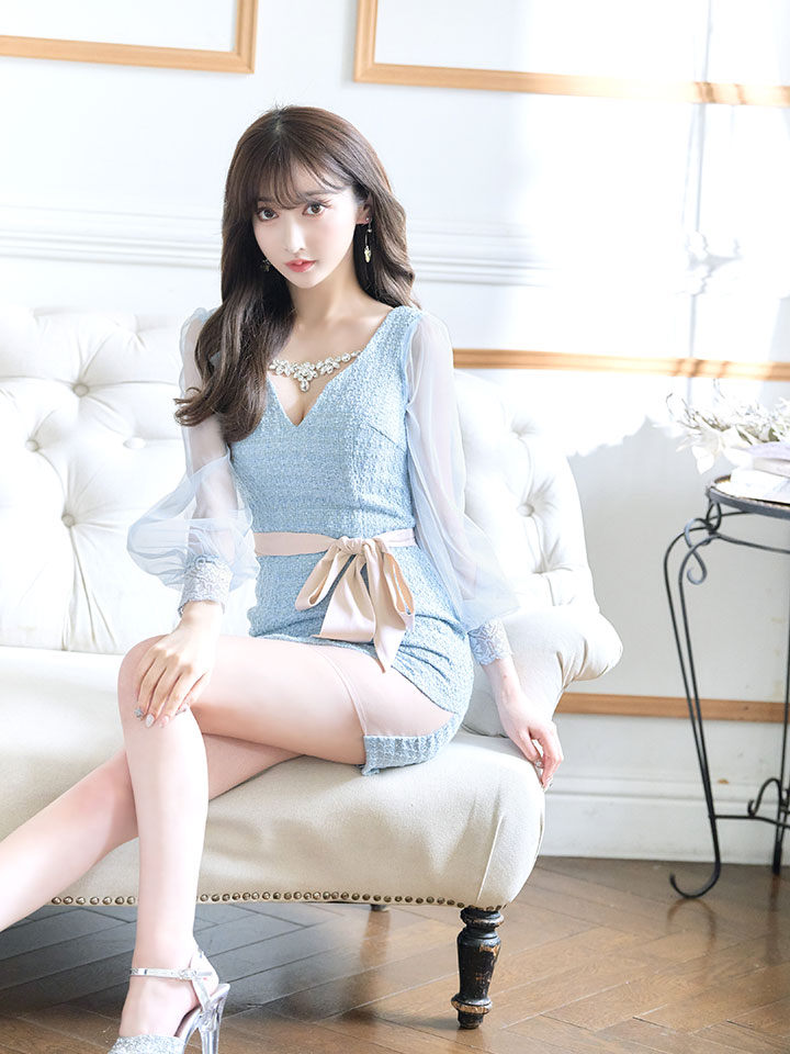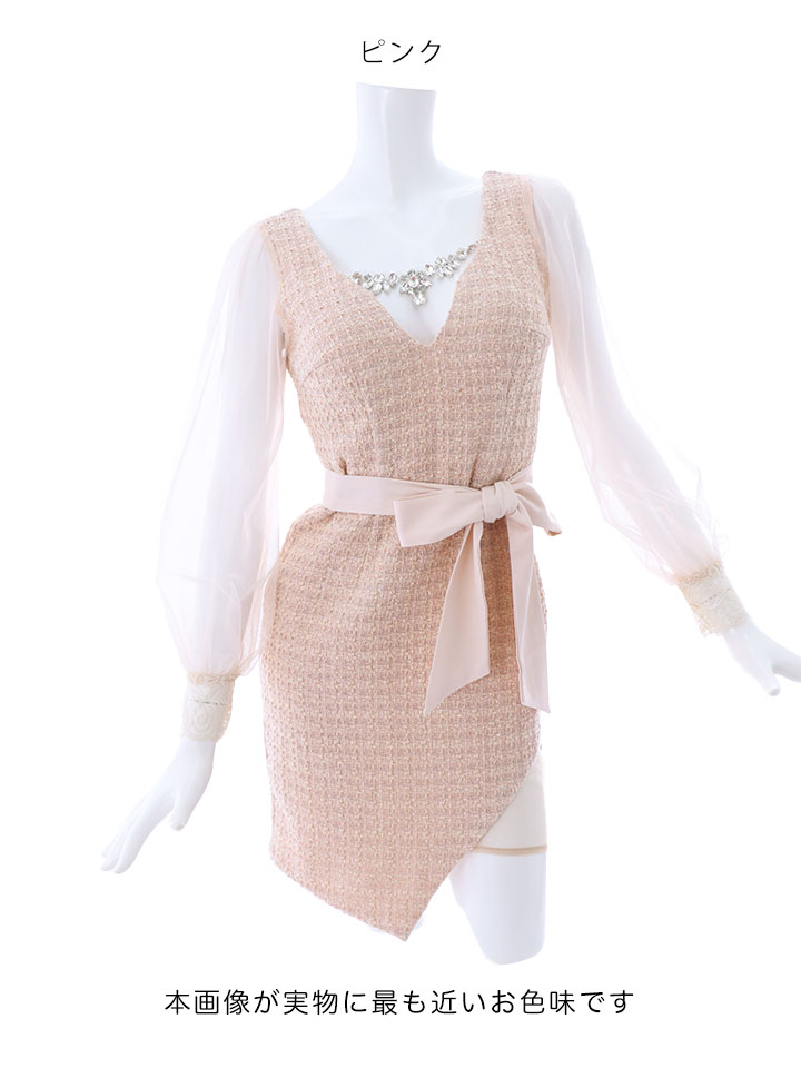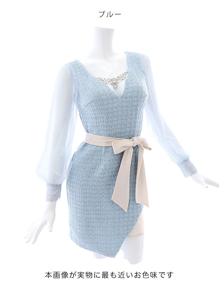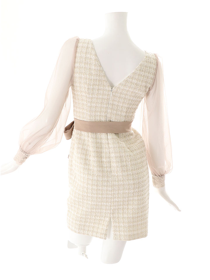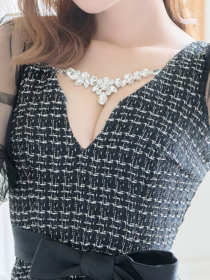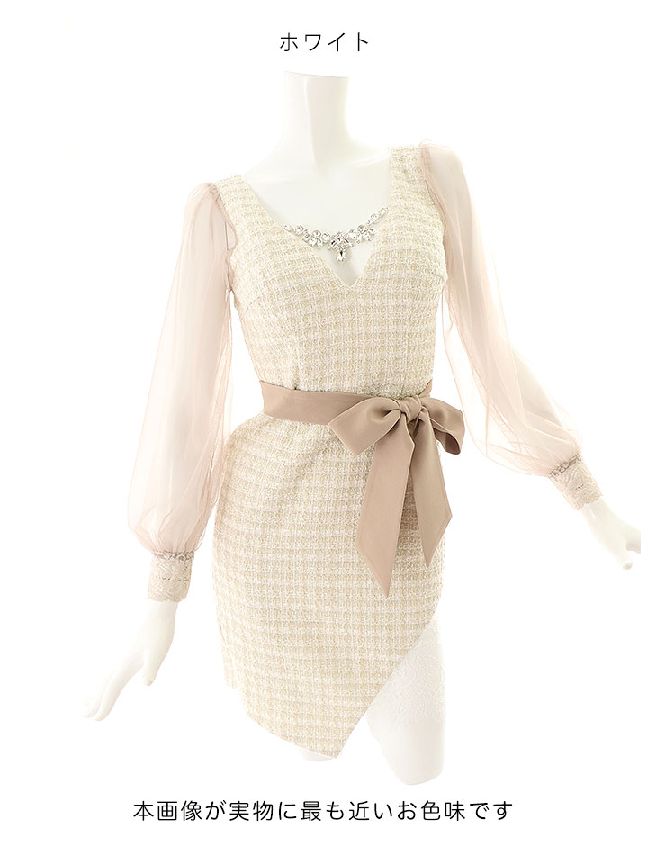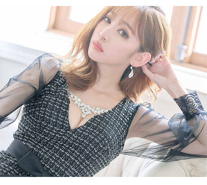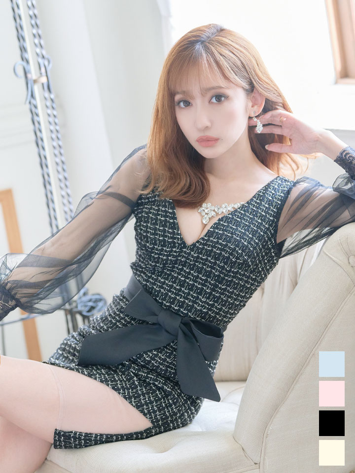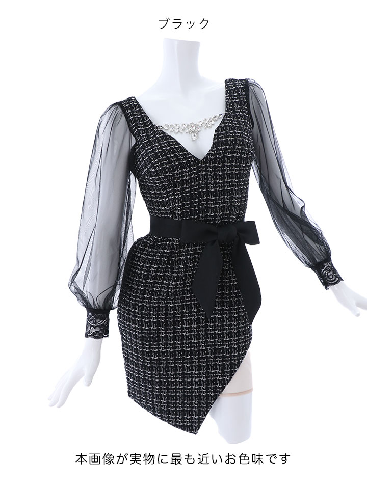 SALE!ブラックツイードチュールスリーブドレス/チェック柄/レース/リボンベルト/ビジュー/タイト/透け/谷間見せ/キャバドレス/ミニドレス【S-XLサイズ/4カラー】[OF03-X] 【YN】dz [4507YNdzw-2206-1]