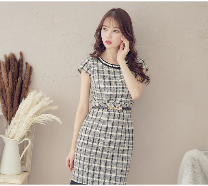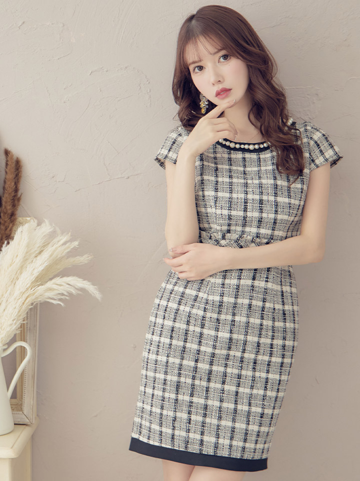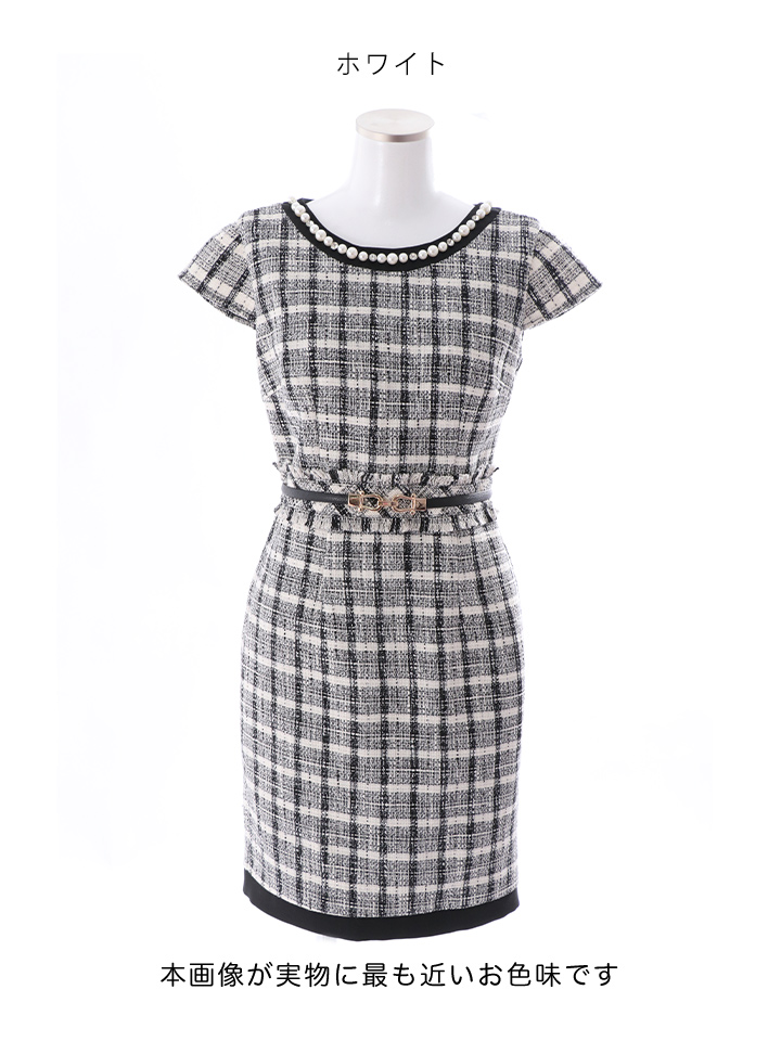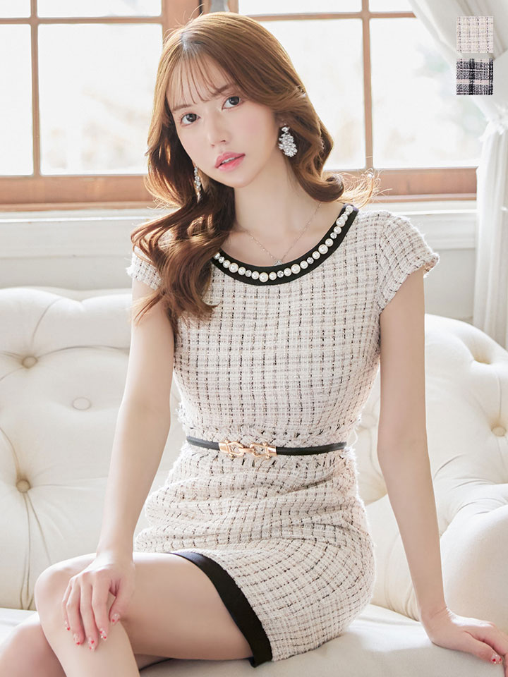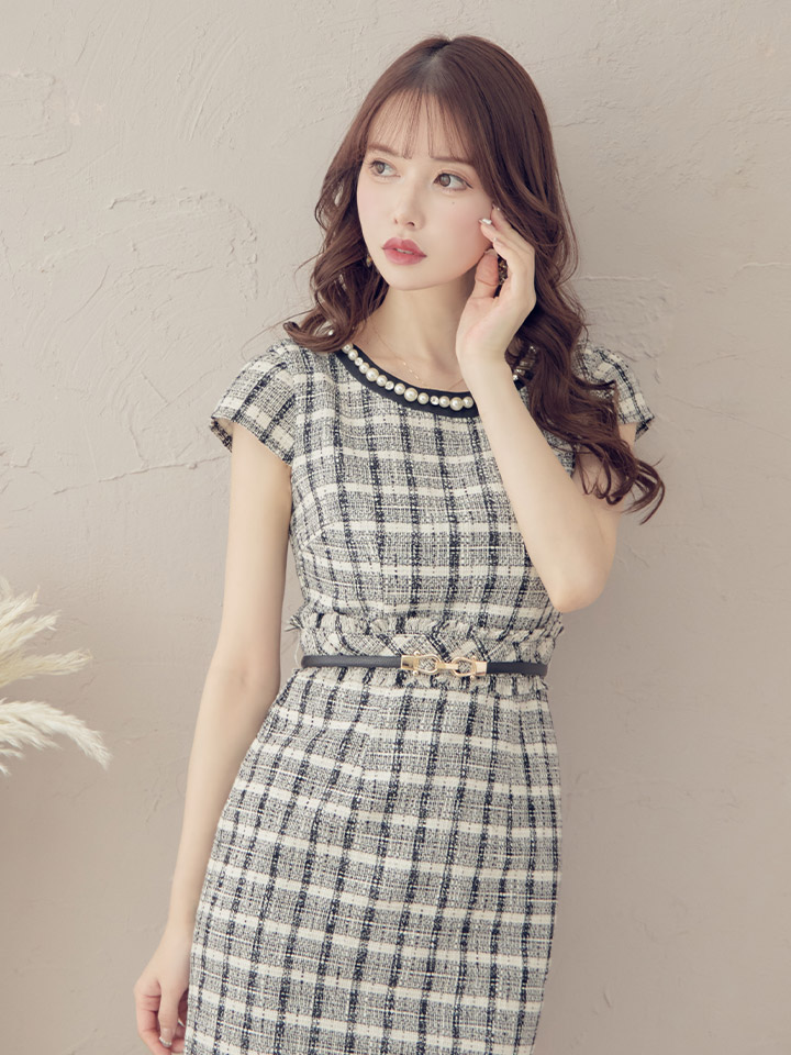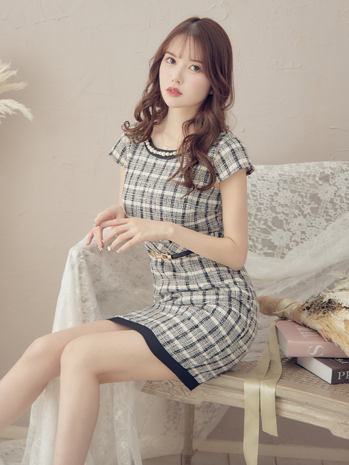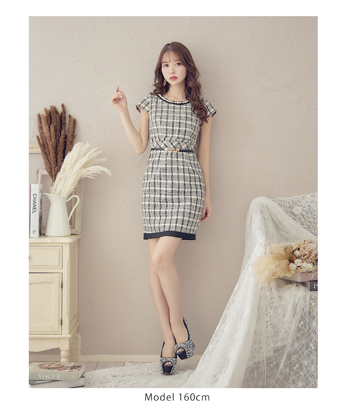 SALE!チェック柄ツイードミニドレス/黒ベルト/ビジュー/ツイード/タイトスカート/胸元隠し/背中隠し/キャバドレス/パッド無し/ワンピース/ミニドレス【S-XLサイズ/1カラー】[OF03-X] 【YN】dzc [4489YNdzc-2211-1]