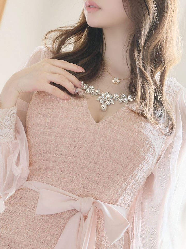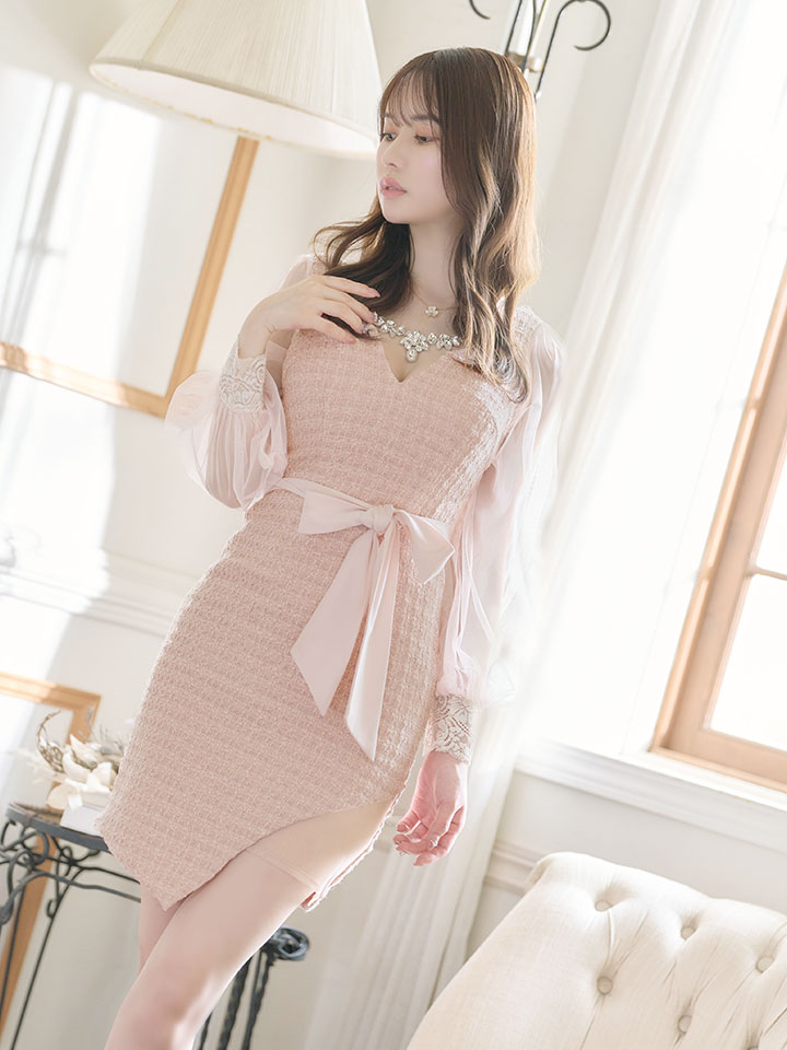 SALE!ピンクツイードチュールスリーブドレス/チェック柄/レース/リボンベルト/ビジュー/タイト/透け/谷間見せ/キャバドレス/ミニドレス【S-XLサイズ/4カラー】[OF03-X] 【YN】dzw [4507YNdzw-2206-2]