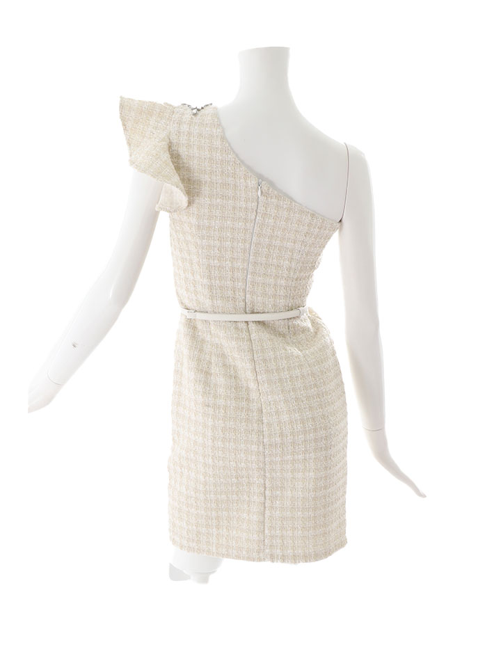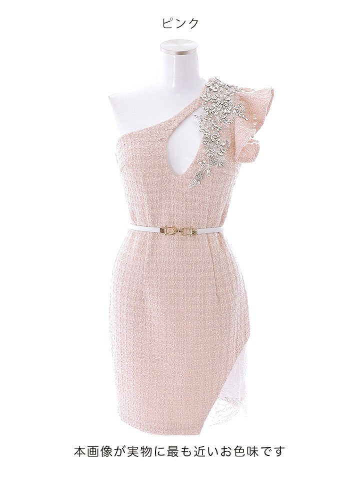 SALE!再入荷!ワンショルダーデコルテ刺繍ドレス/ツイード/フェイクスリット/谷間魅せ/ミニドレス/キャバドレス【S-Lサイズ/2カラー】[OF03-X] 【YN】 [4508YNdzw-240215-1]