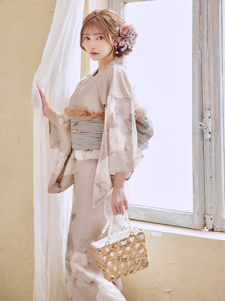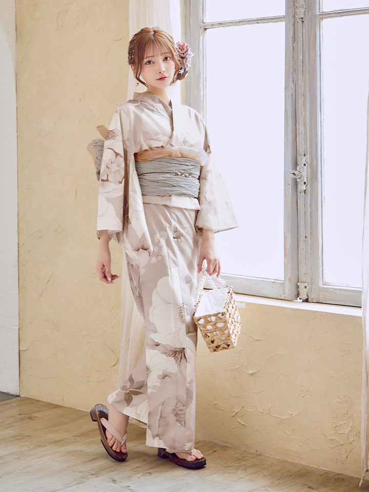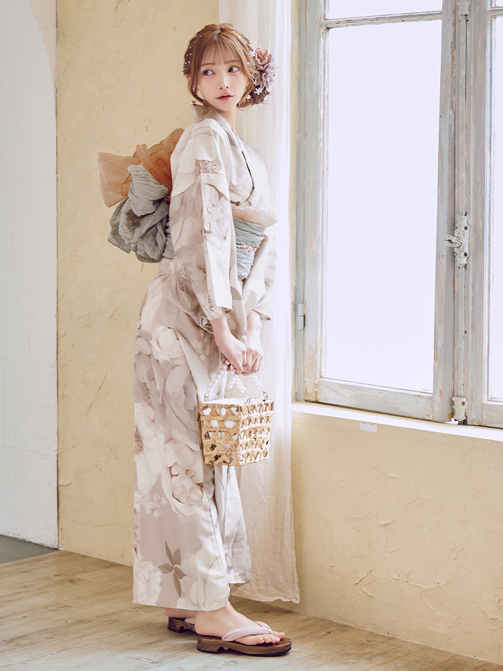 ベージュフラワー浴衣【浴衣3点セット 浴衣/帯/下駄】[yo/YMT] [Y-9141-sb-dzao-P-F-25cc]