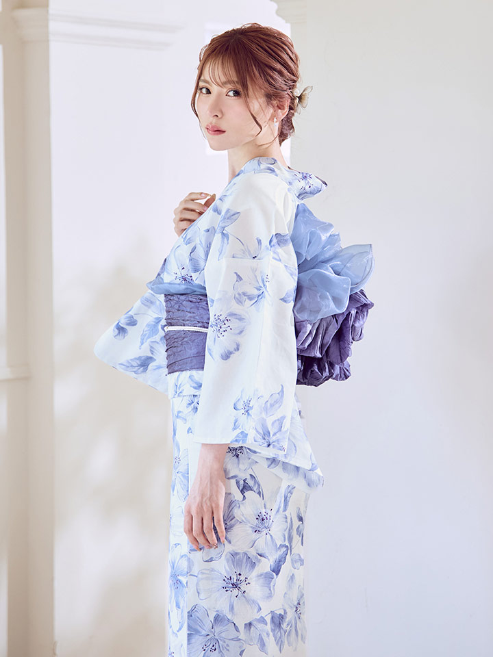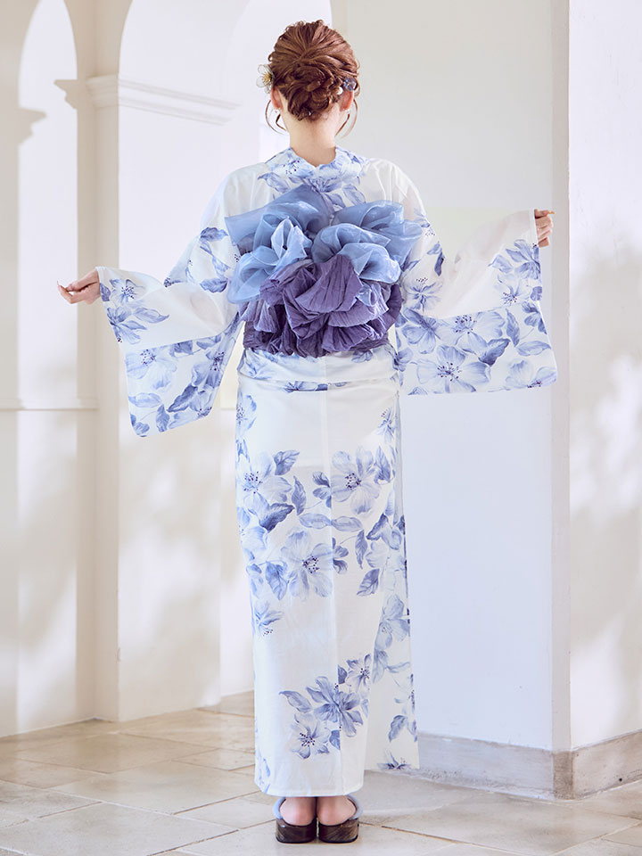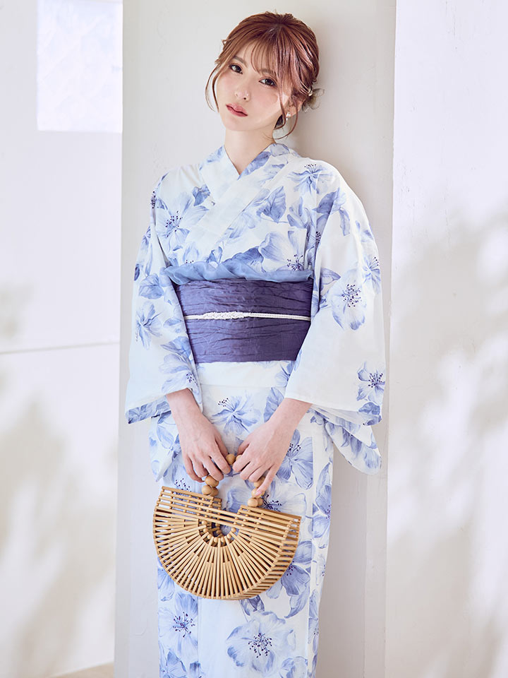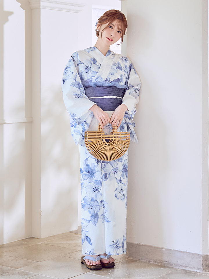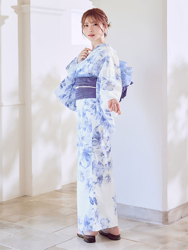 ホワイトに小柄なフラワーが花開くエレガントな大人浴衣。