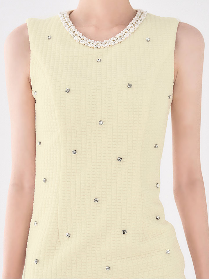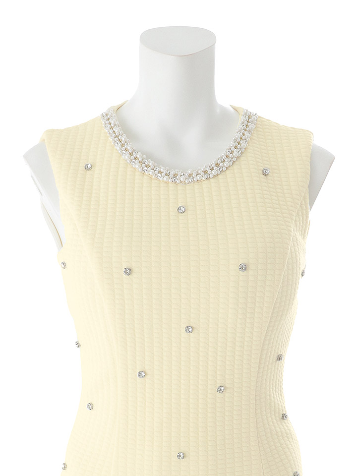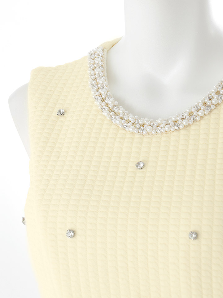 ノースリーブで腕まわりすっきり、首元のビジューが女の子らしい華やかさを演出。