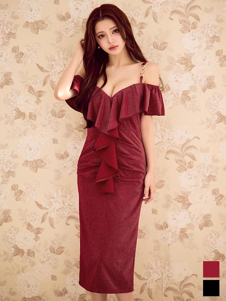 フリルオフショルダーミディアムドレス/キャバドレス【XS-Mサイズ/2カラー】[OF03B] 【IM】 [J-971IM-250905-1]
