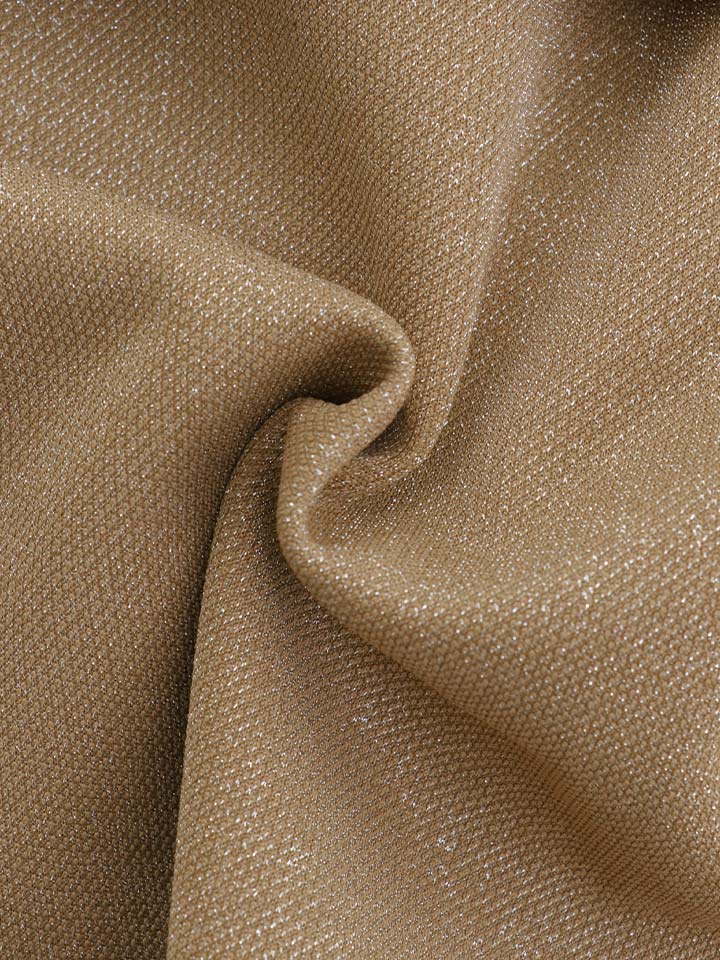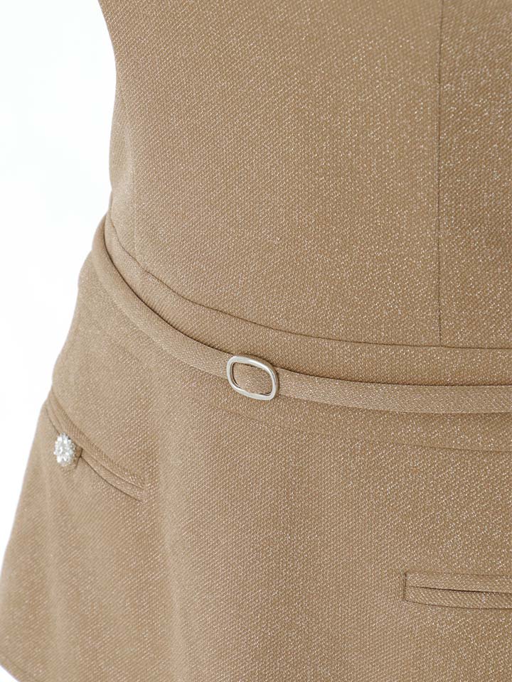 ウエストマークの細ベルトでスッキリしたラインを叶え、きらめくストレッチ生地が主役感を放つ。