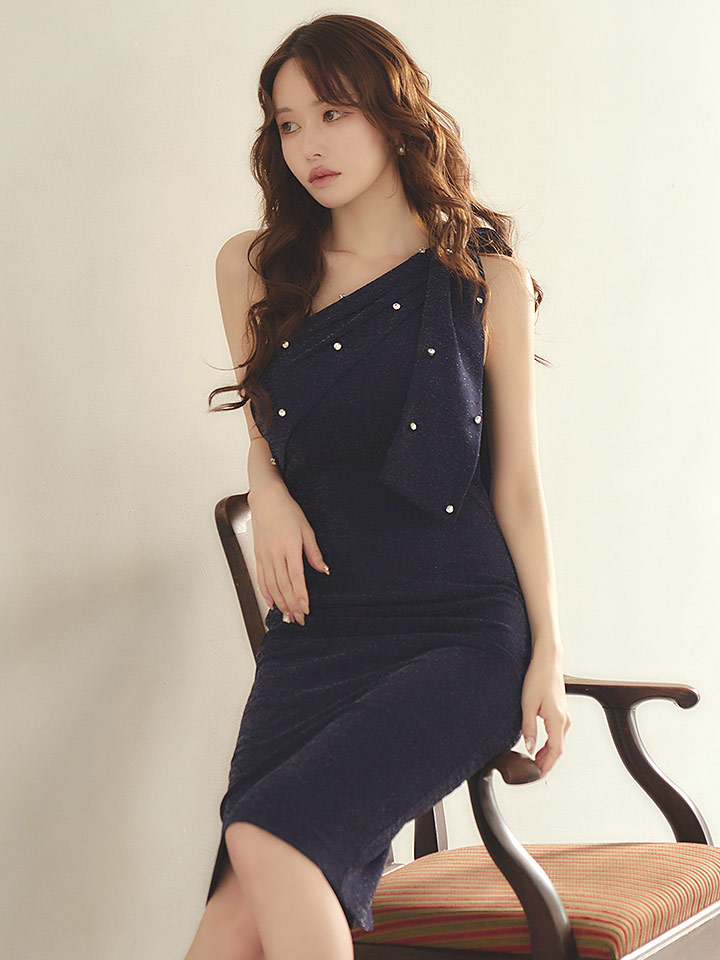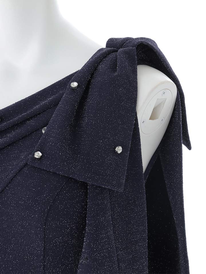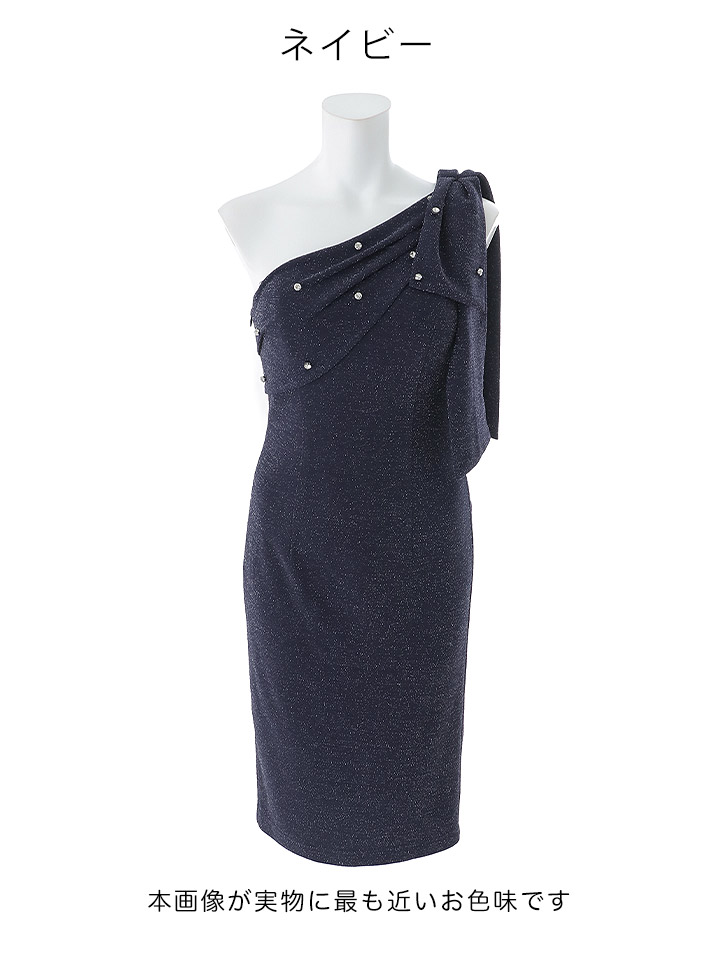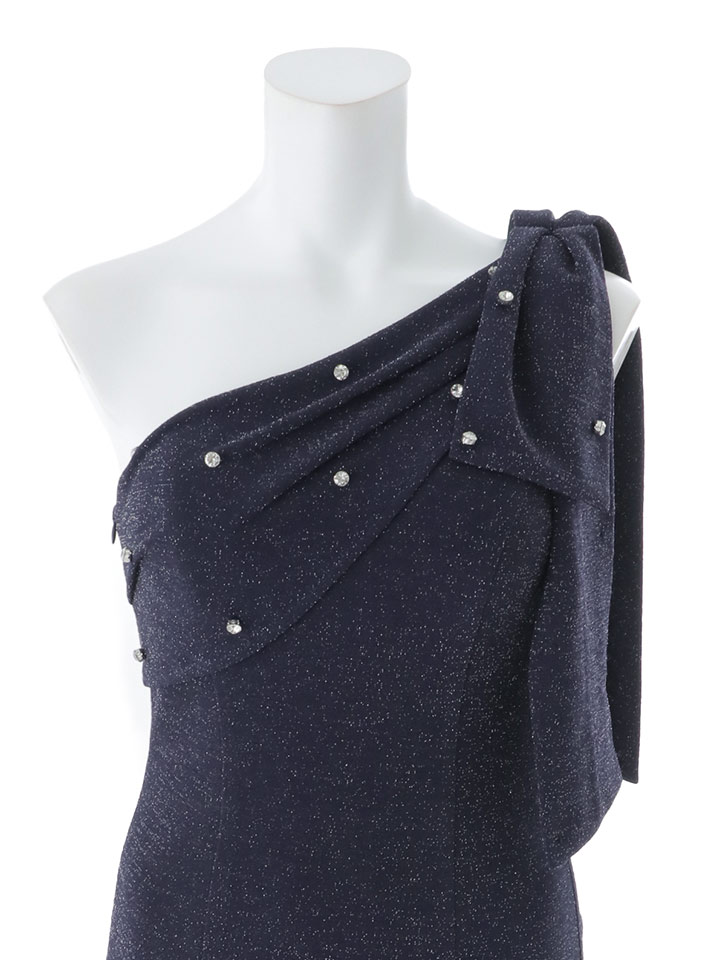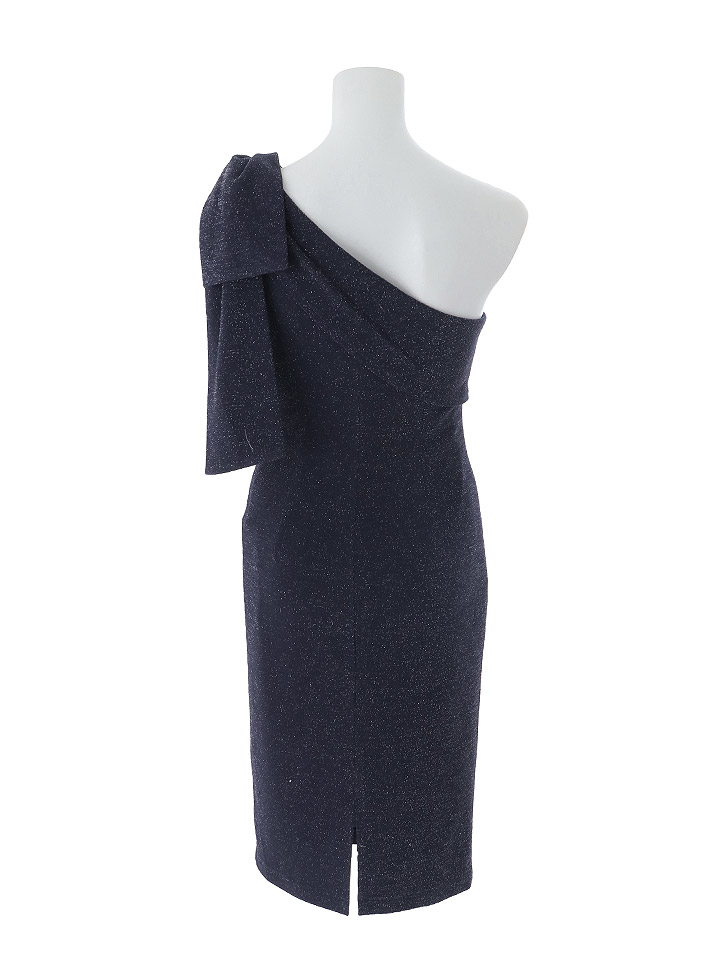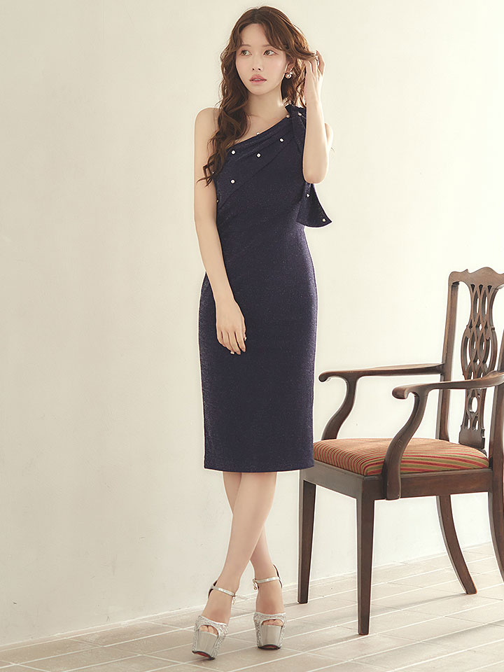 #ネイビー #ネクスト銀座 ゆめ #ミディアム丈ドレス #ストレッチ ラメ(グリッター) #無地 #ワンショルダー #背中見せ(魅せ) #タイト #上品・華やか・お姉さん系