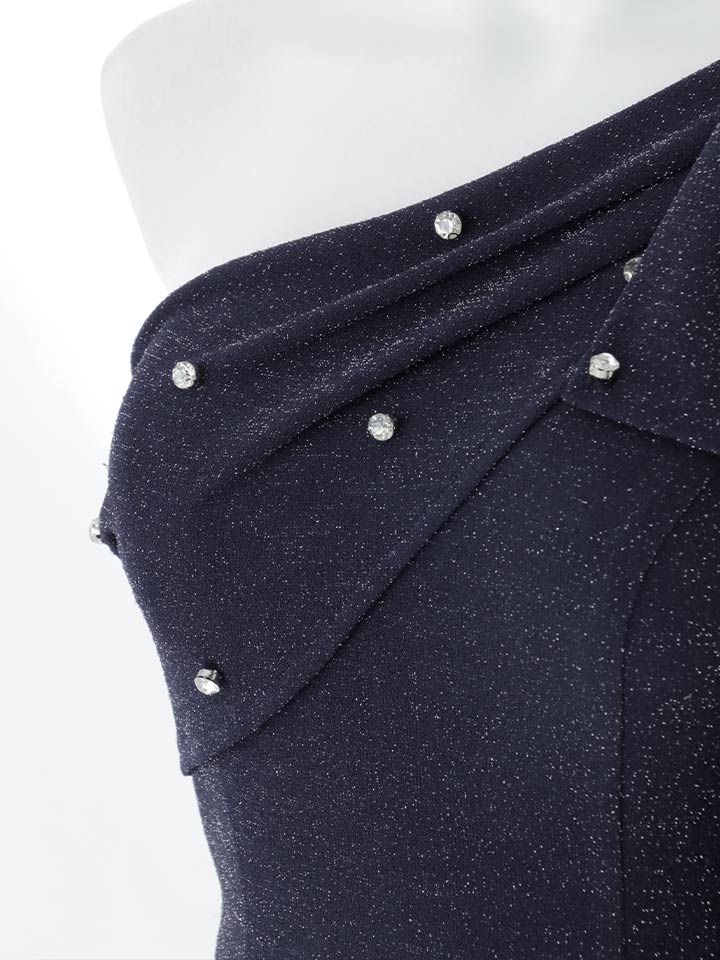 ほどよい肌見せが大人の色気を引き立て、ビジューの装飾が煌めきを添えます。