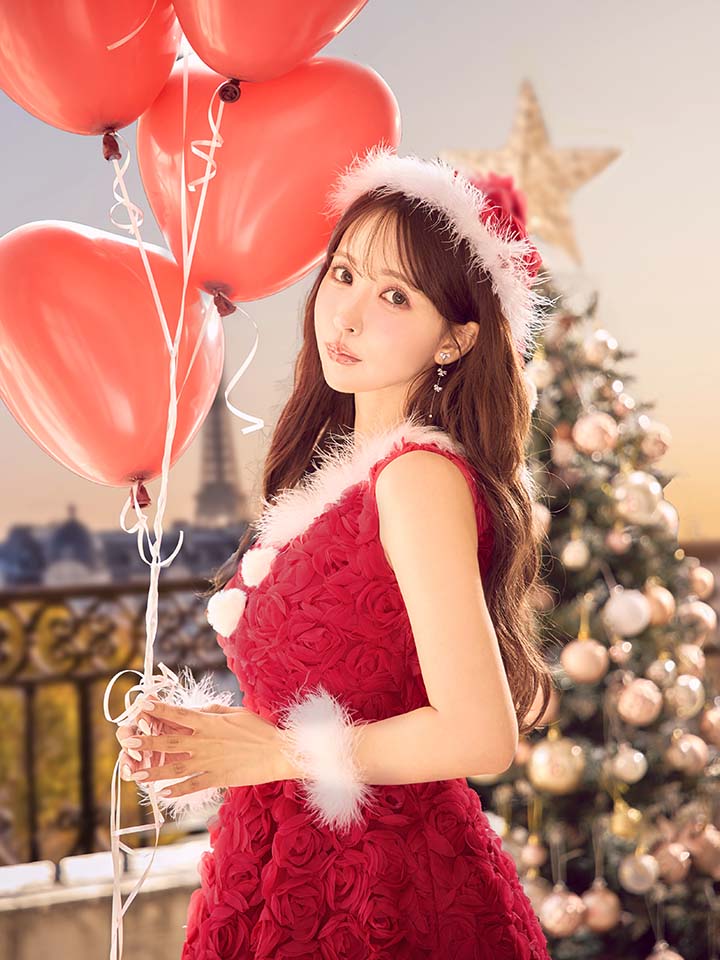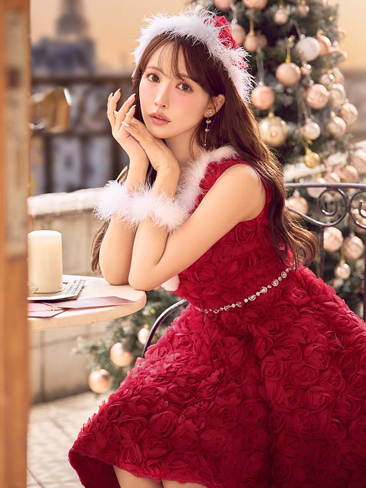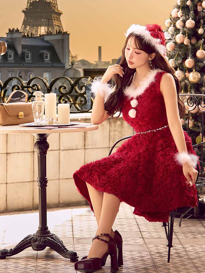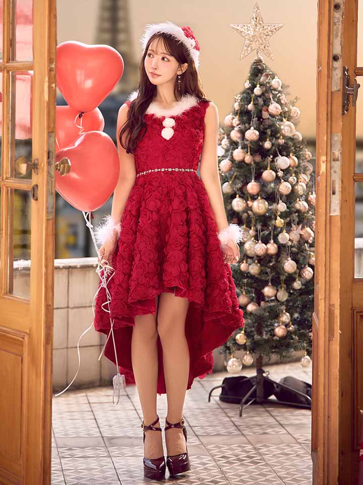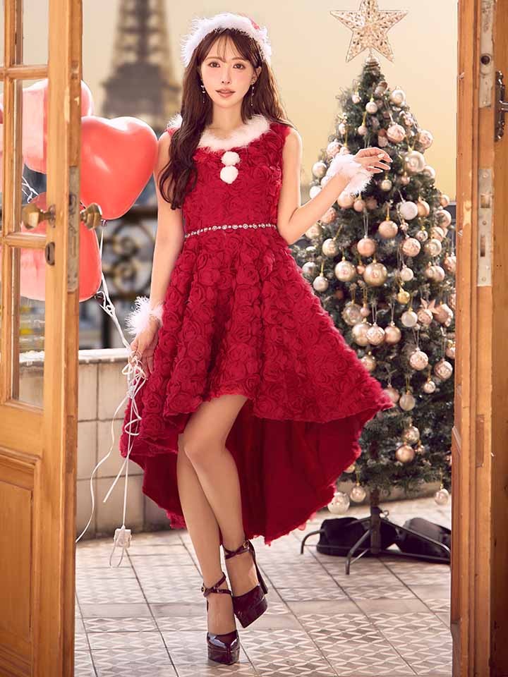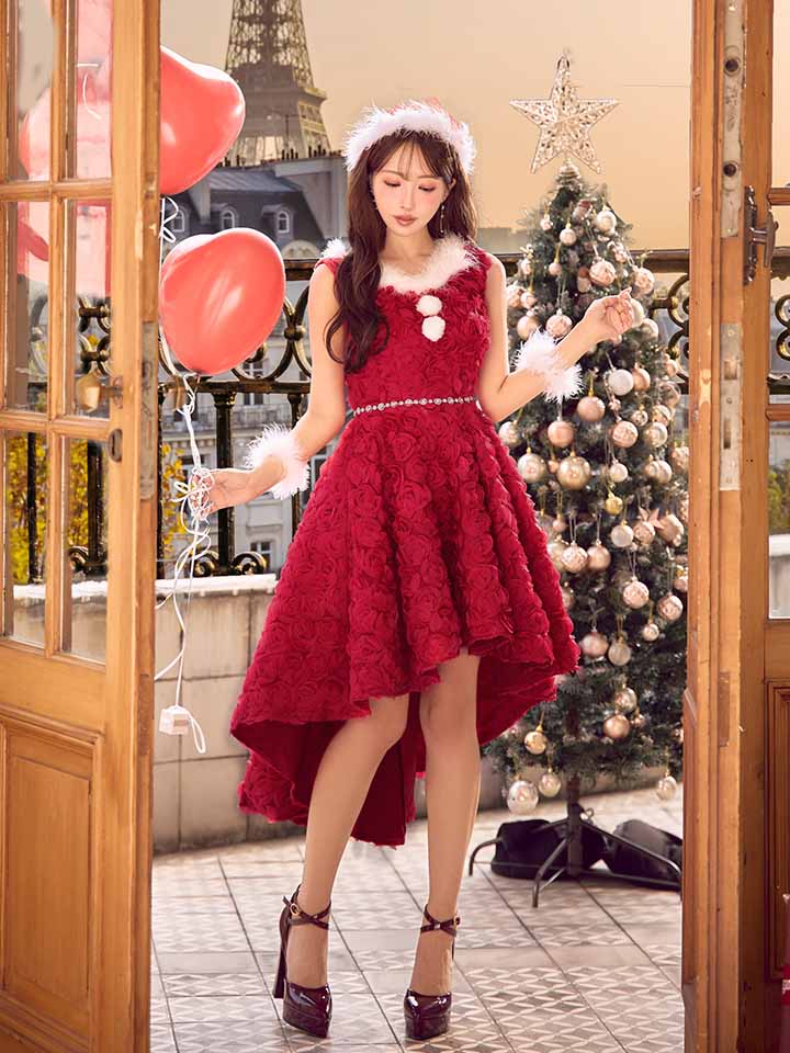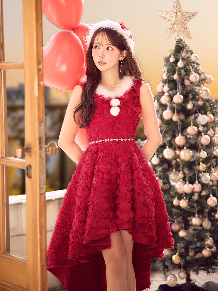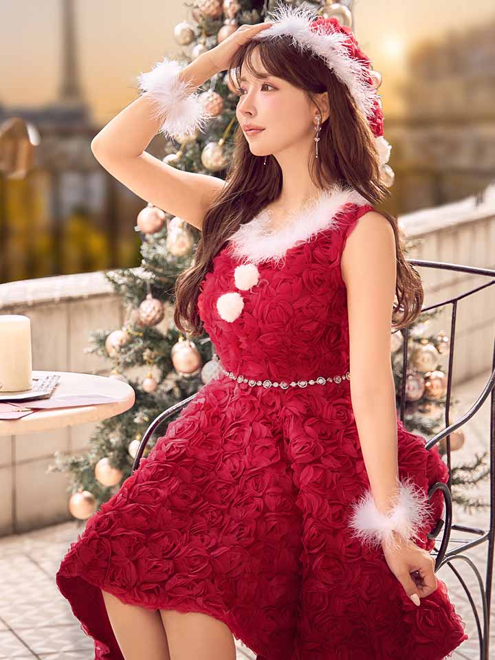 #フレア #ワンピース #ノースリーブ #ショートインスカート #立体ローズ #クリスマス #パーティ #サンタコス #サンタさん