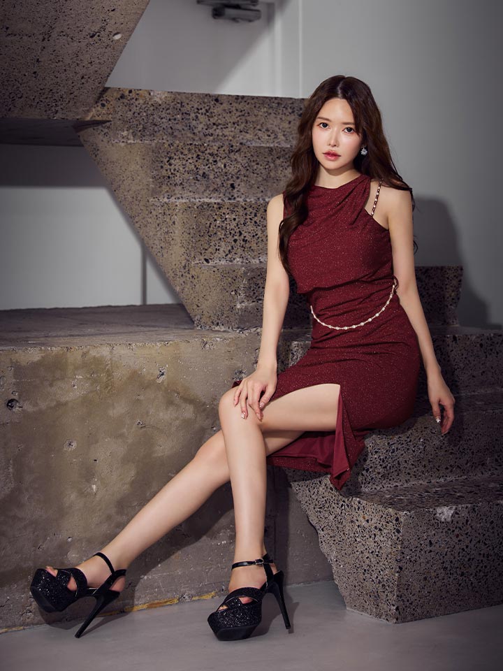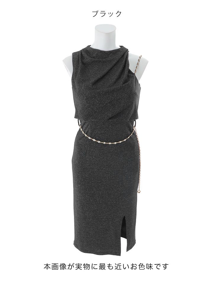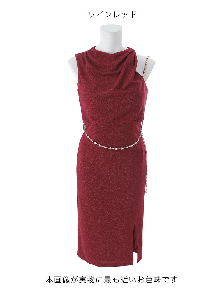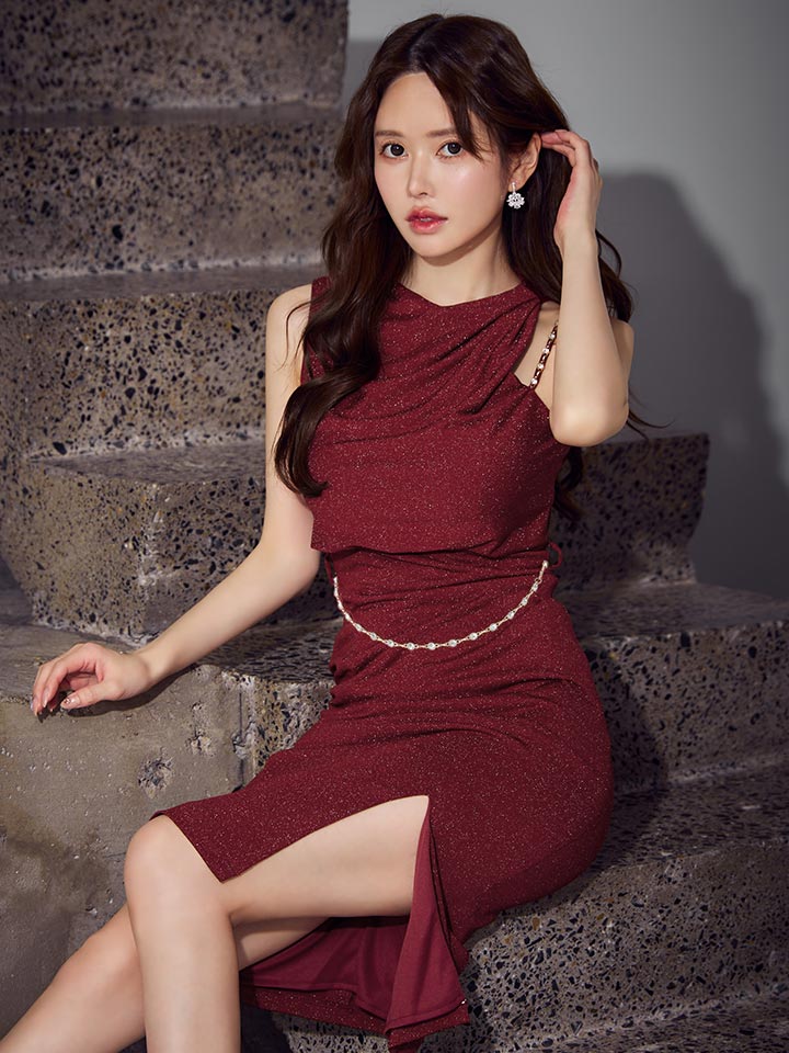ビジューのキラキラチェーンやドレープを効かせたデザインのディティールが大人の余裕を感じさせるリッチな一着。