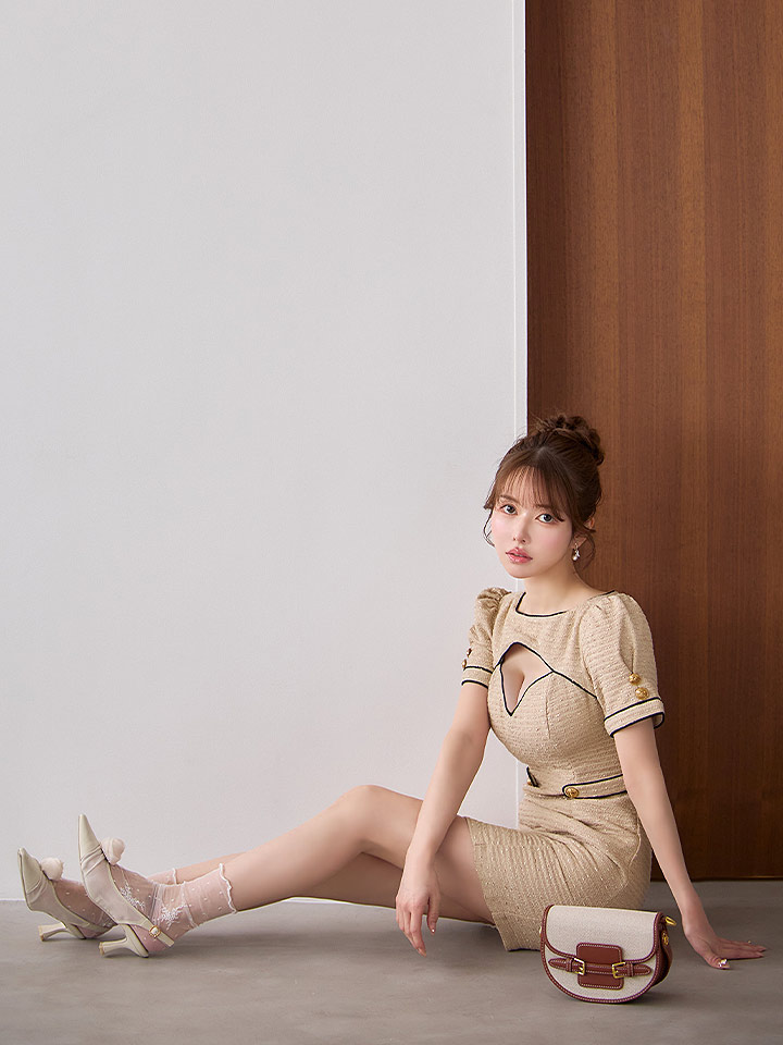 #ベージュ #ツイード #ミニドレス/ミニ丈 #半袖,ショートスリーブ #谷間見せ(魅せ) #背中隠し(ブラOK) #タイト #上品・華やか・お姉さん系 #JEWELSトレンド #ネクスト銀座 ゆめ