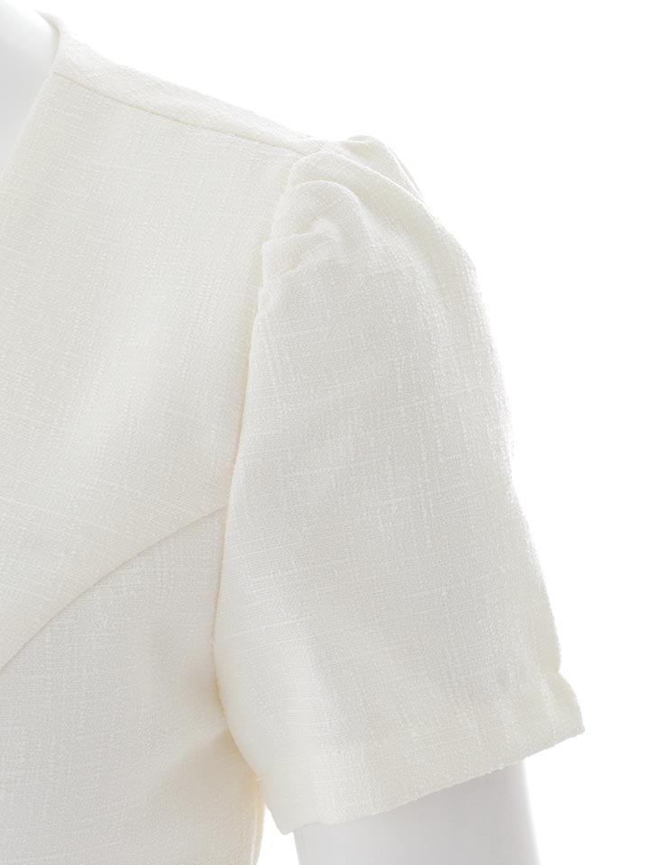 半袖デザインで抜け感をプラスしつつ、ビジューボタンが上品な華やかさを添えます。