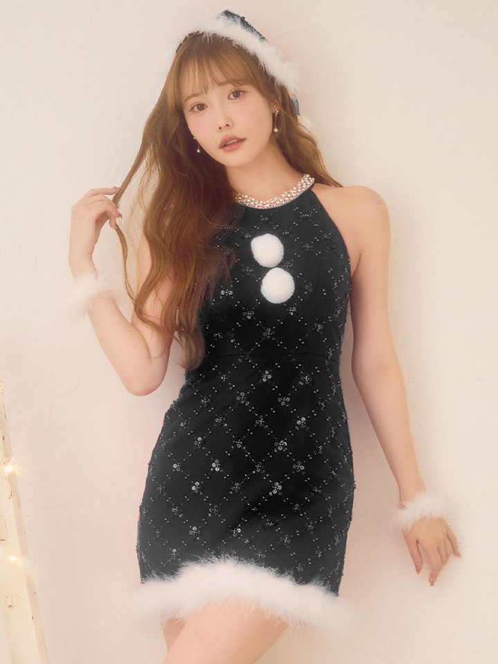 煌めくネックラインのビジューが顔まわりを華やかに彩り、