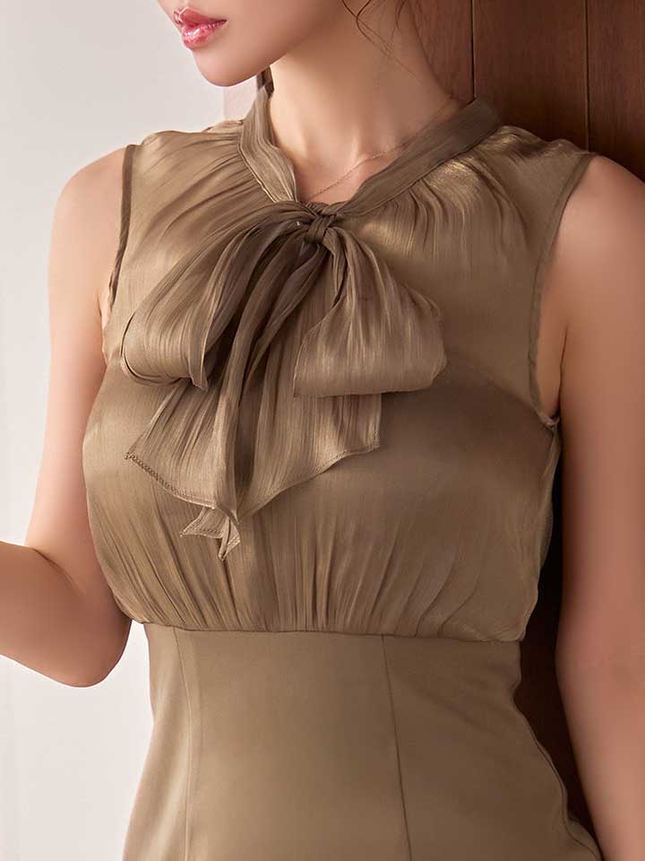 胸元のリボンが華やかなアクセントとなり、女性らしい曲線を美しく引き立てます。