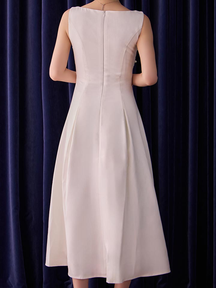 ノースリーブデザインとパールの装飾がほどよい華やかさを添える、綺麗めスタイルの一枚。