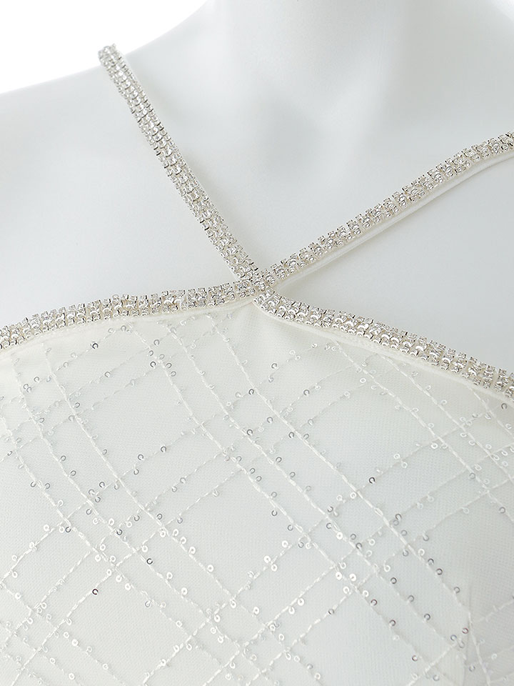 V字にあしらわれたビジューが輝きを放つ、上品でゴージャスなミニドレス。