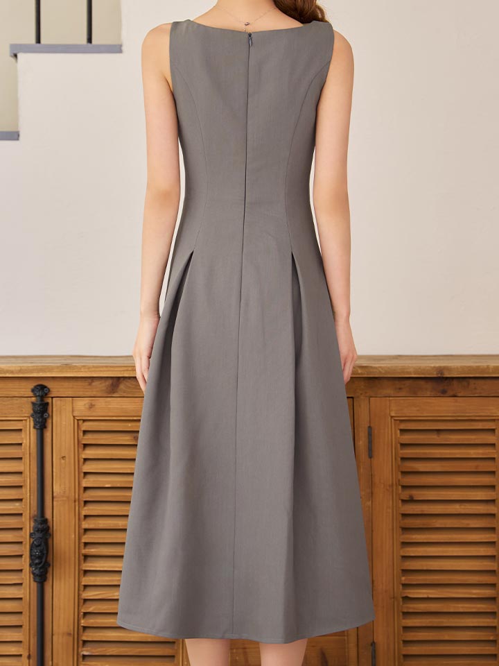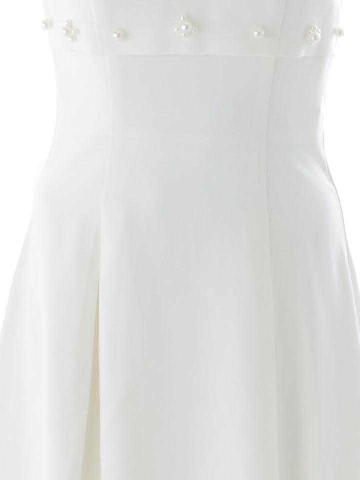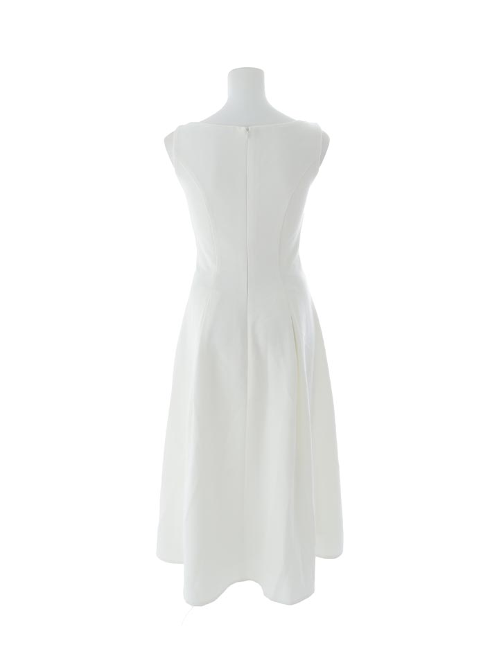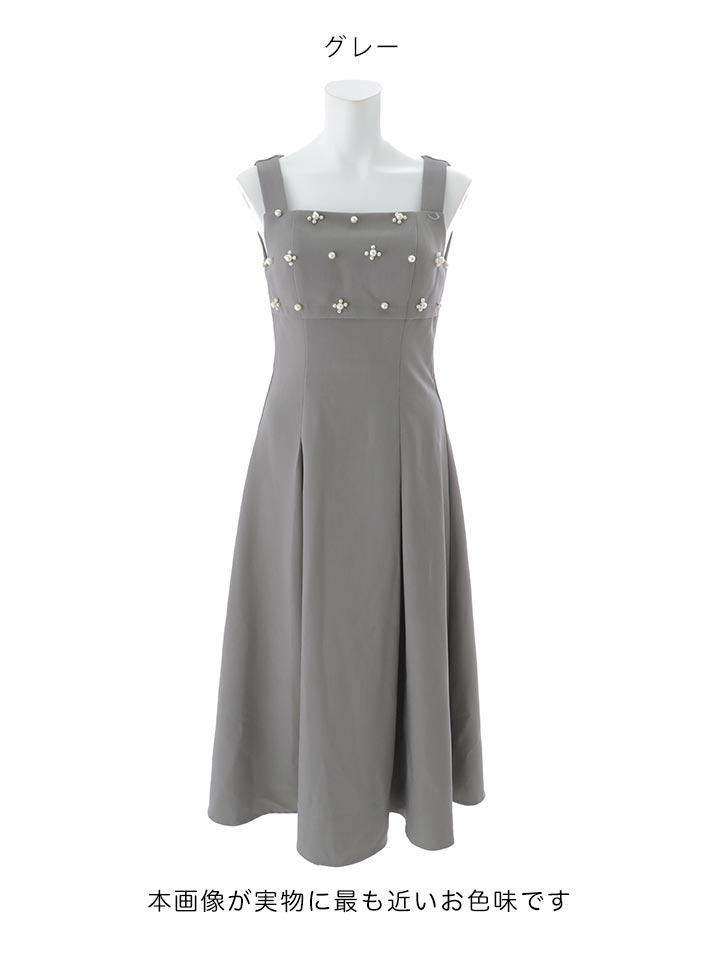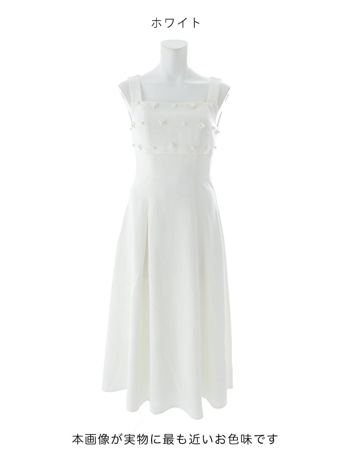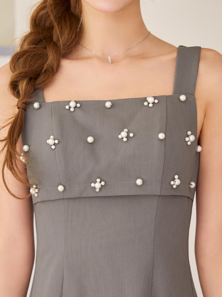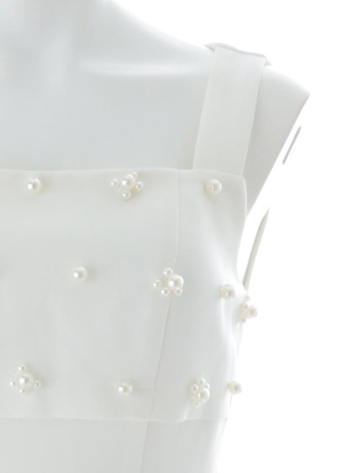 ノースリーブデザインとパールの装飾がほどよい華やかさを添える、綺麗めスタイルの一枚。