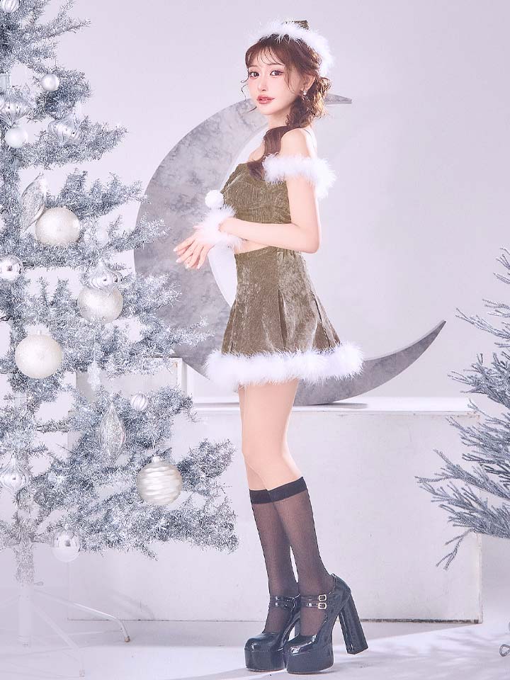 ブラウン グレー クリスマス ビジュー ベロア ドレス ファー付きワンピース キャバドレスクリスマス イベントドレス