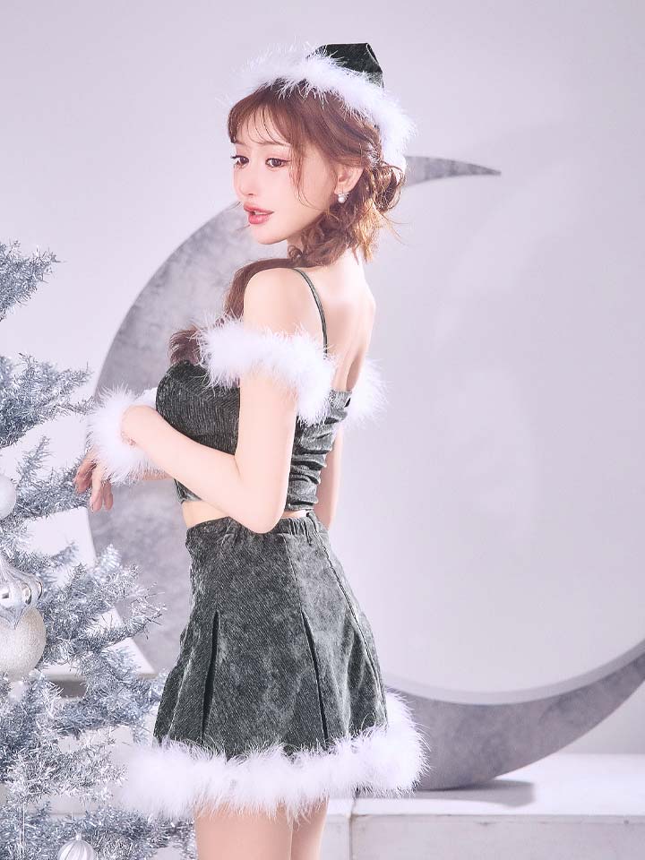 肩やスカート、袖口にあしらったホワイトファーディテールが、