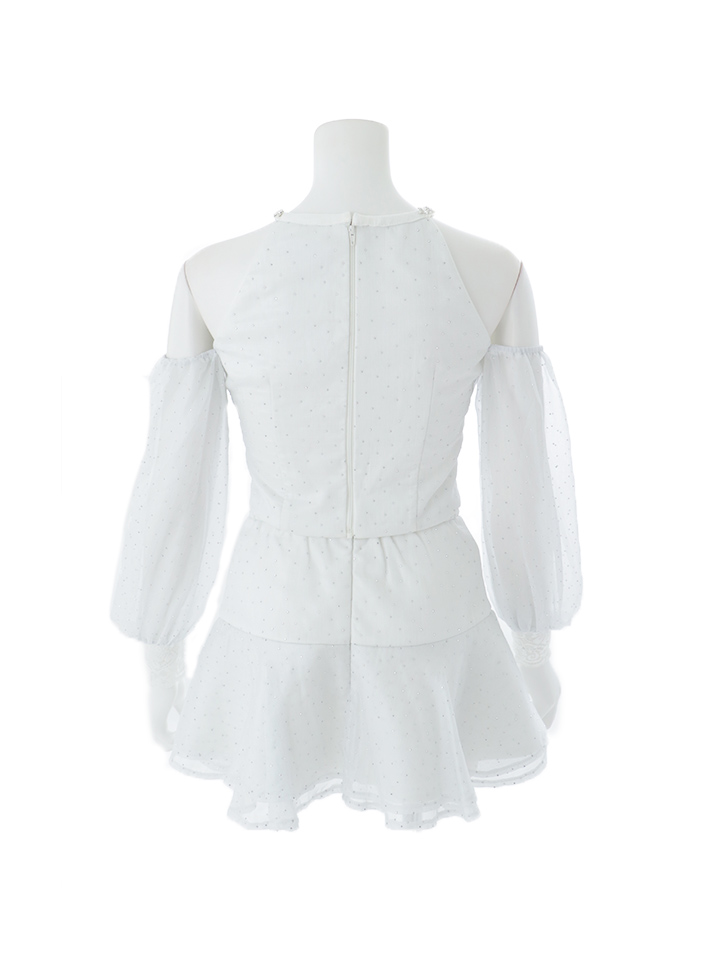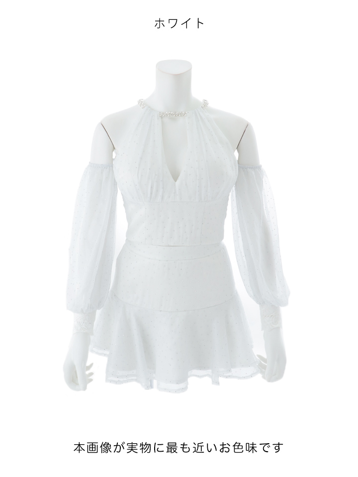 胸元のビジューが視線を惹きつけ、チュール袖が女性らしい柔らかさを演出。