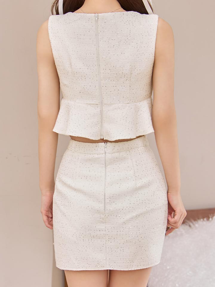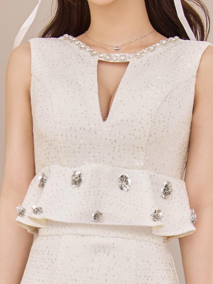 胸元のビジューとトップス裾のお花スパンコールが可愛らしさを引き立て、 タイトなシルエットで甘すぎず大人っぽく着こなせる一着。