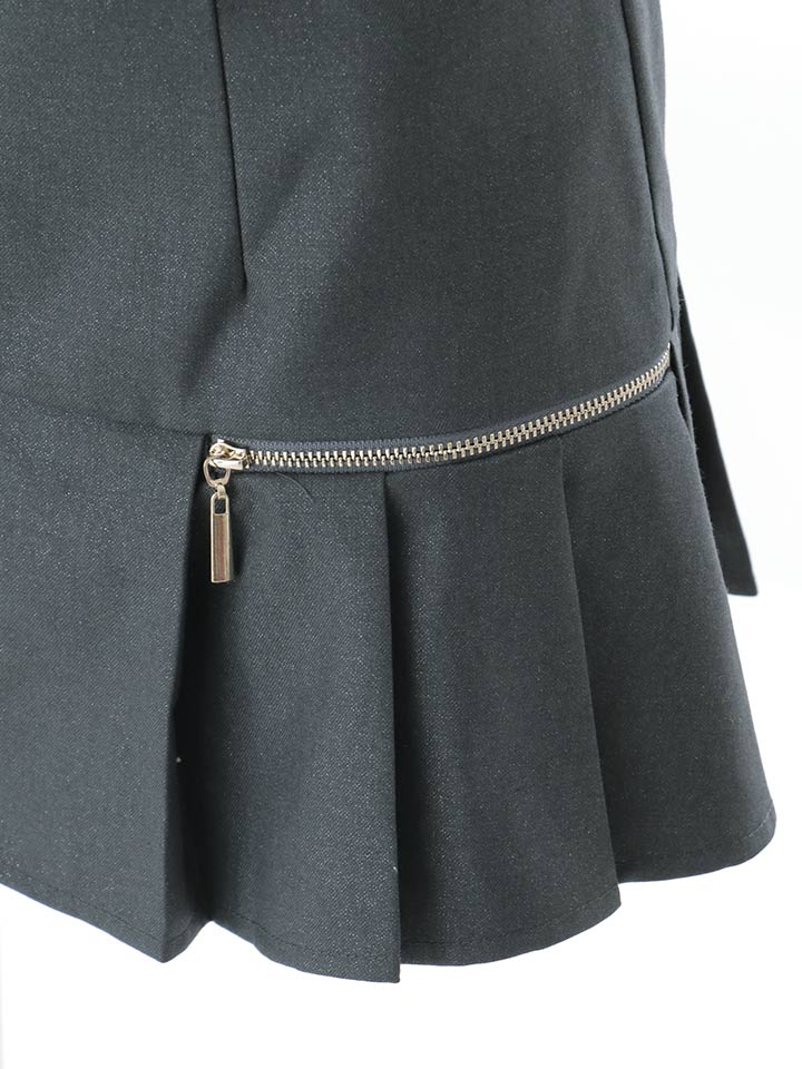 セットアップ風デザインでこなれ感を演出し、スカートのファスナーのあしらいがさりげないアクセントに。