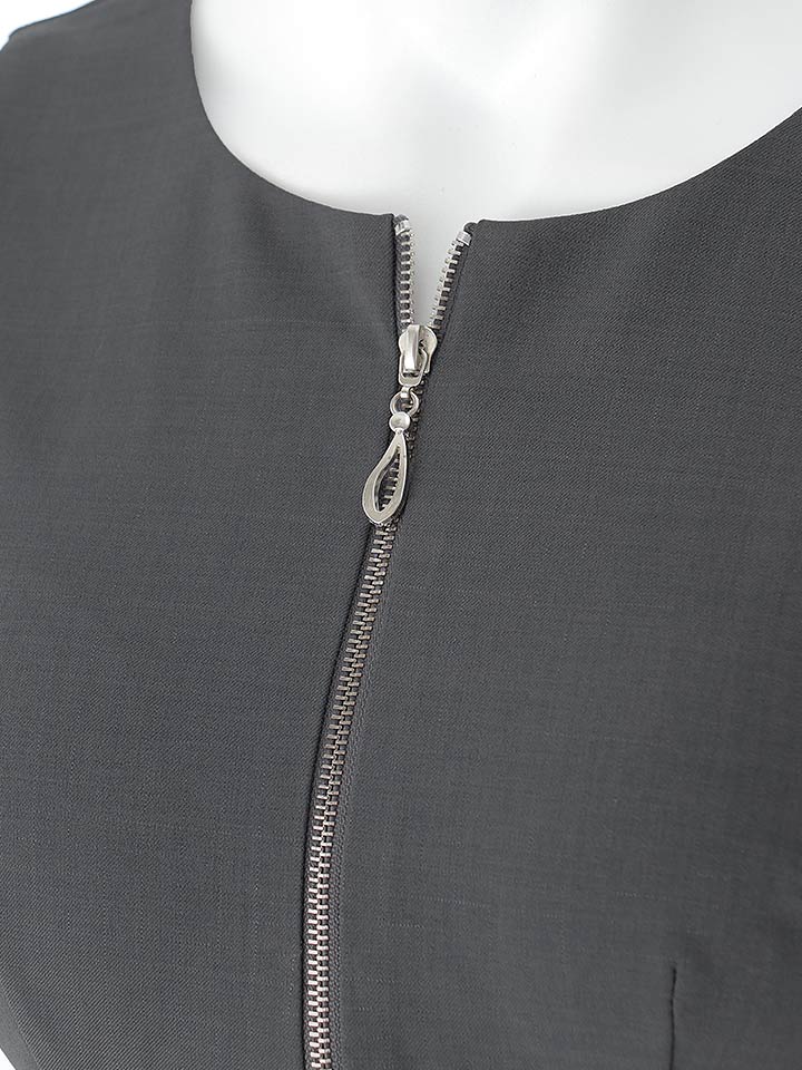 胸元のファスナーで開き具合を調整でき、ウエストのダブルベルトがアクセントになったデザインです。