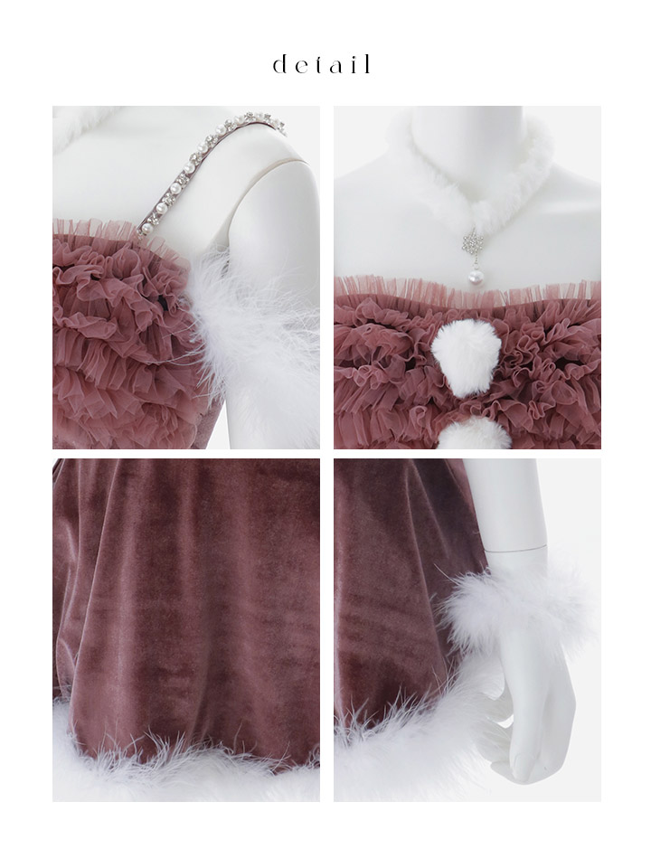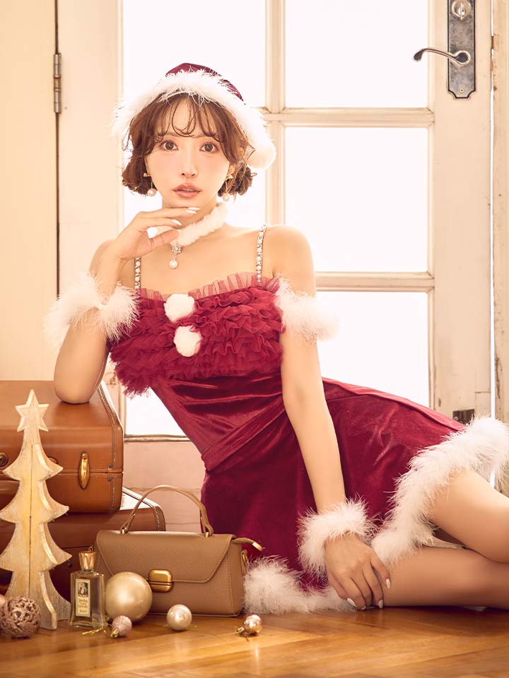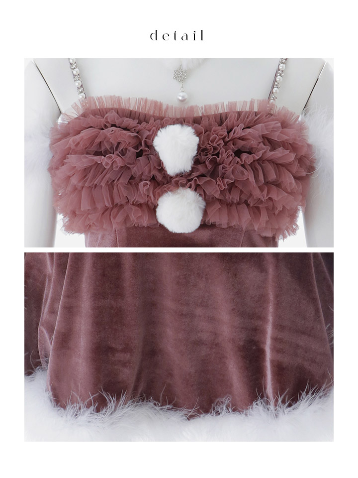 ブラウン レッド クリスマス フリル ベロア ドレス ファー付きワンピース キャバドレスクリスマス イベントドレス