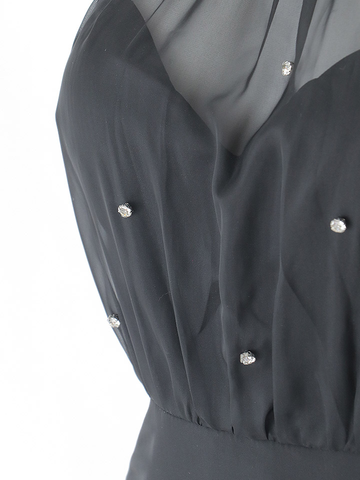 胸元のシアー素材がほどよく肌を透かし、女性らしい魅力を引き立てます。
