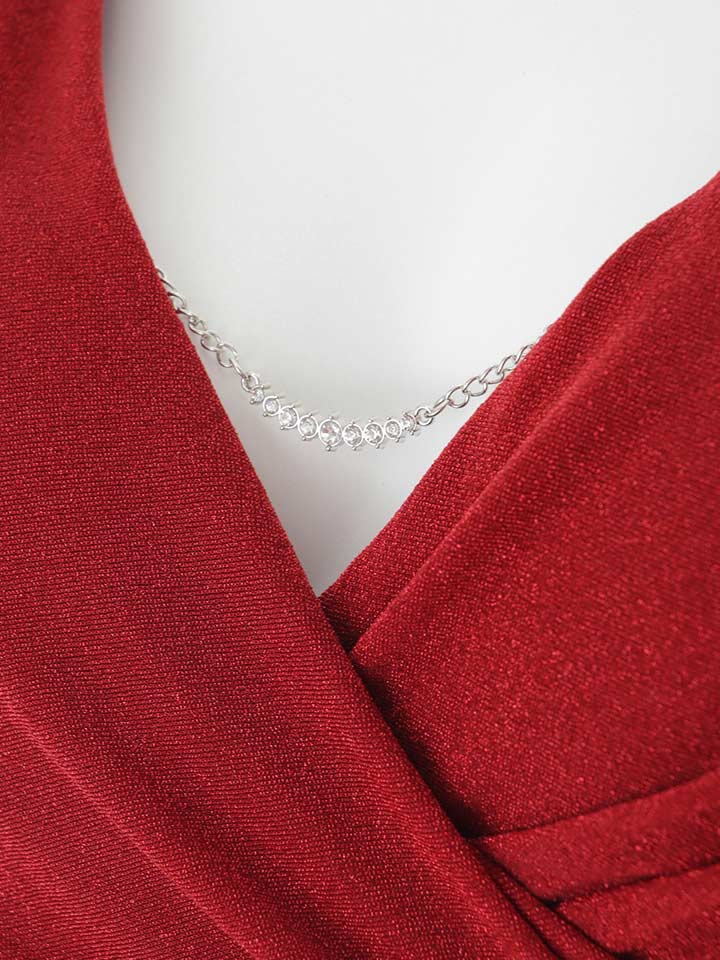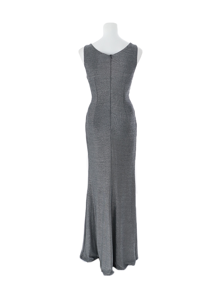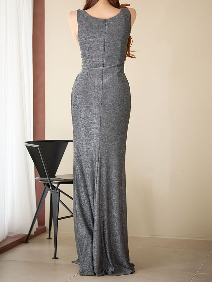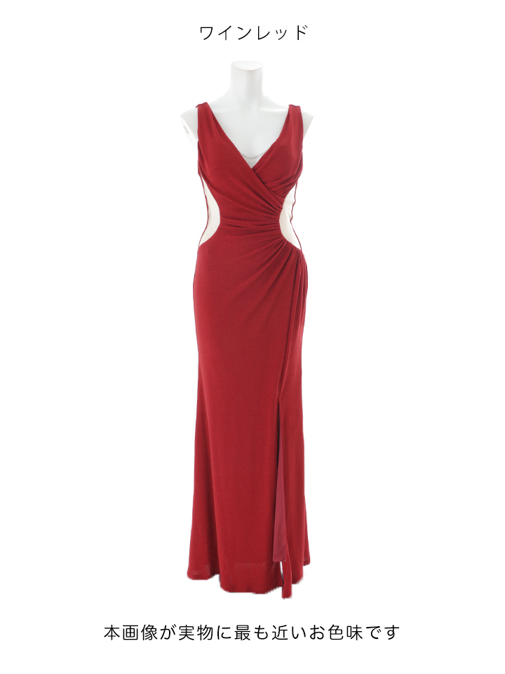 谷間を美しく魅せる上品な胸元デザインと、サイドスリットがさりげなく肌見せを叶えるロングドレス。