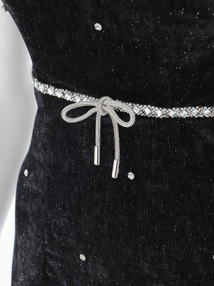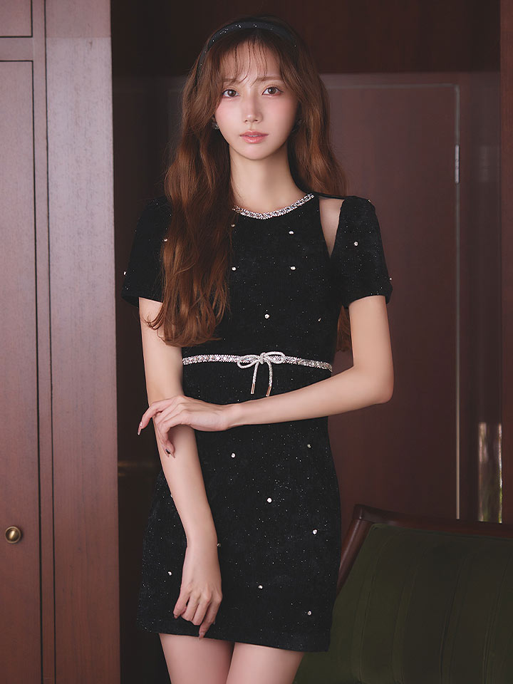 ウエストにはビジューラインとビジューリボンをあしらい、タイトスカートが女性らしいシルエットを演出。