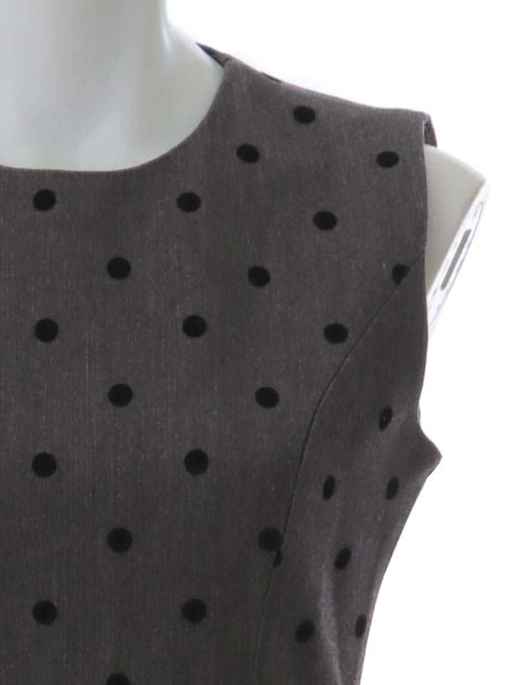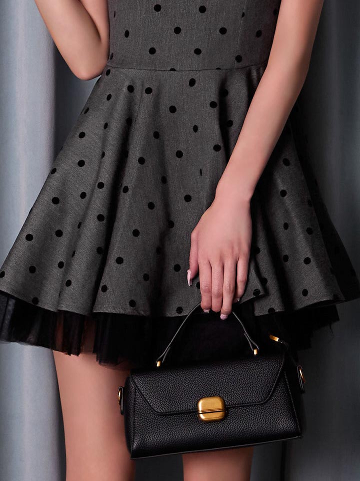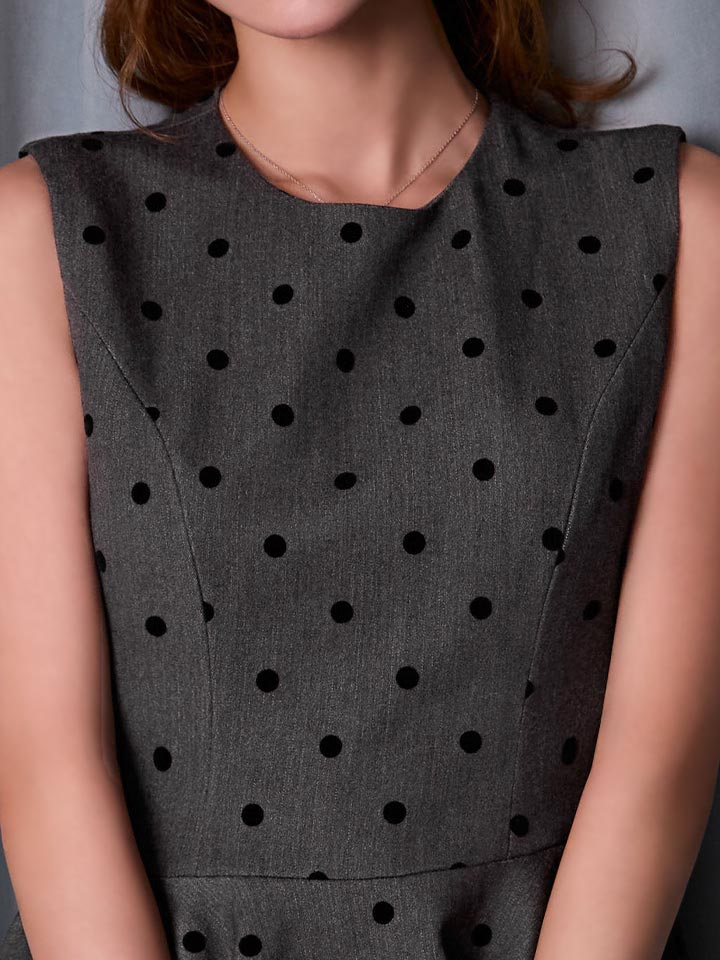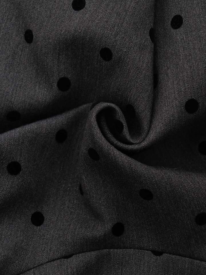 谷間は閉じた上品なデザインで、トレンド感のあるドット生地がほどよい遊び心を添えてくれる。