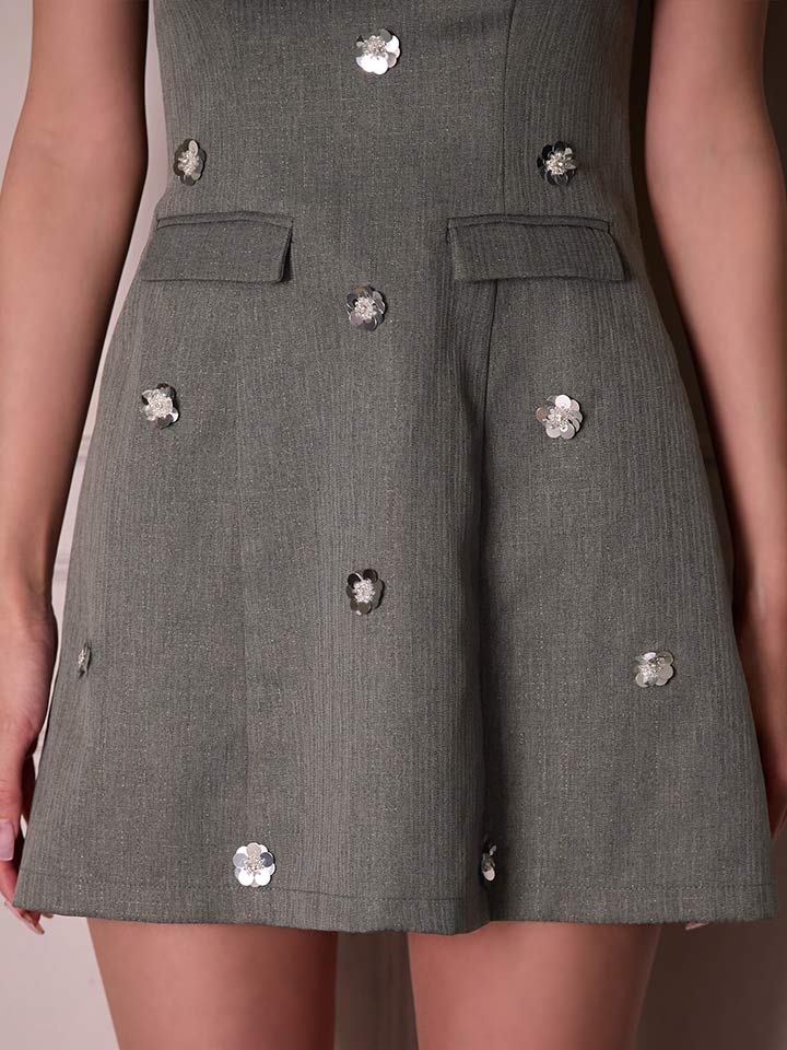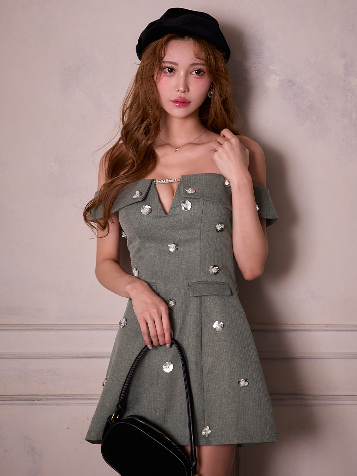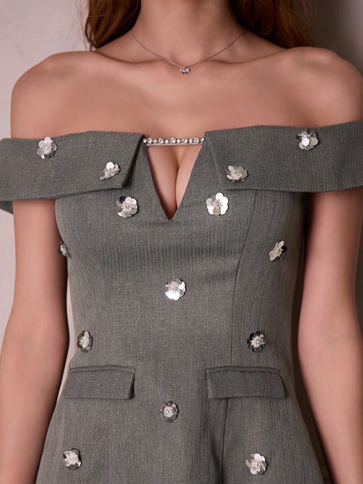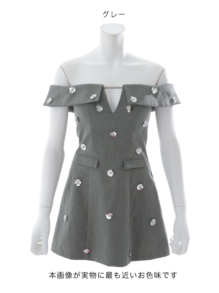 #グレー #るりぴ #ミニドレス/ミニ丈 スーツ生地 ビジュー #オフショルダー #谷間見せ(魅せ) #背中見せ(魅せ) #Aライン・フレアスカート #上品・華やか・お姉さん系 #JEWELSトレンド販売価格: 12,980円(税込)