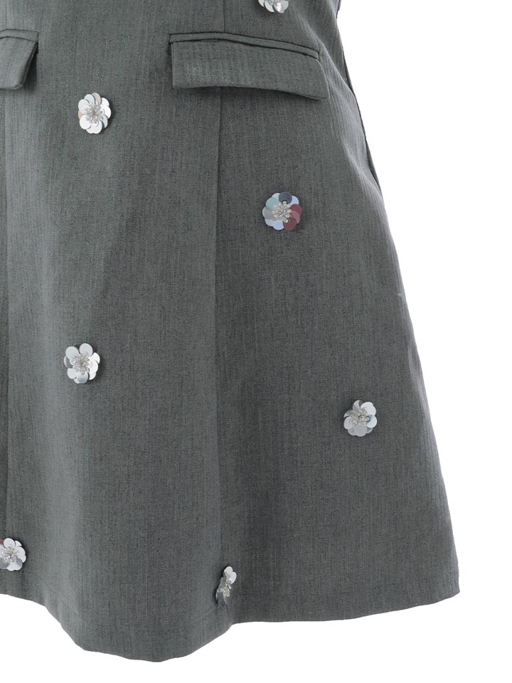 タイトスカートがシルエットをすっきりと見せつつ、スーツ生地に散りばめられたスパンコールのお花が、上品な華やかさを添えてくれる一着。