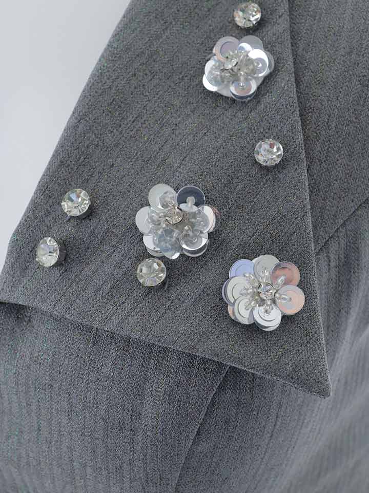 襟付きで上品さをキープしつつ、ビジューのきらめきが華やかさをプラス。