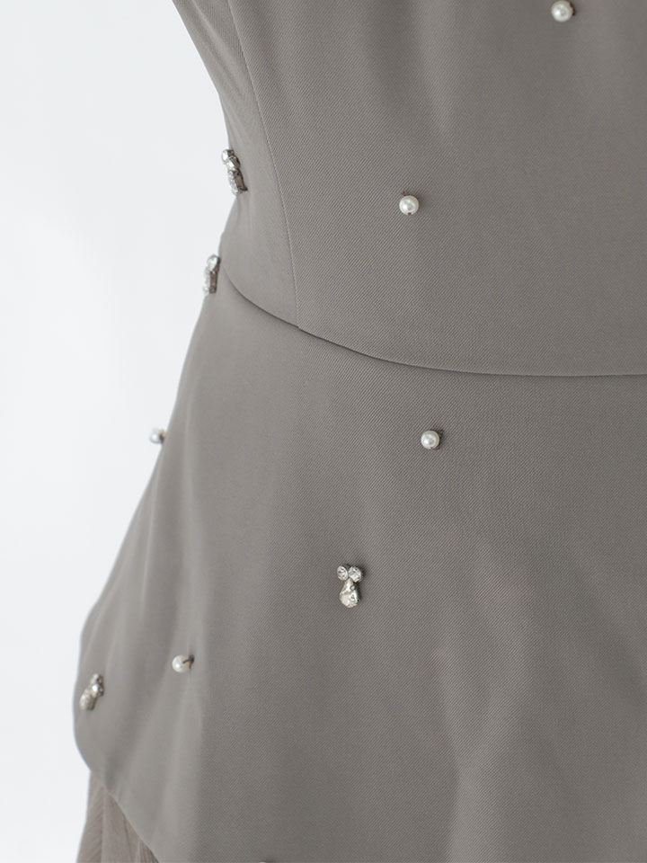 ビジューのあしらいが華やぎを添え、甘さと上品さをほどよく兼ね備えた一着に仕上がっています。