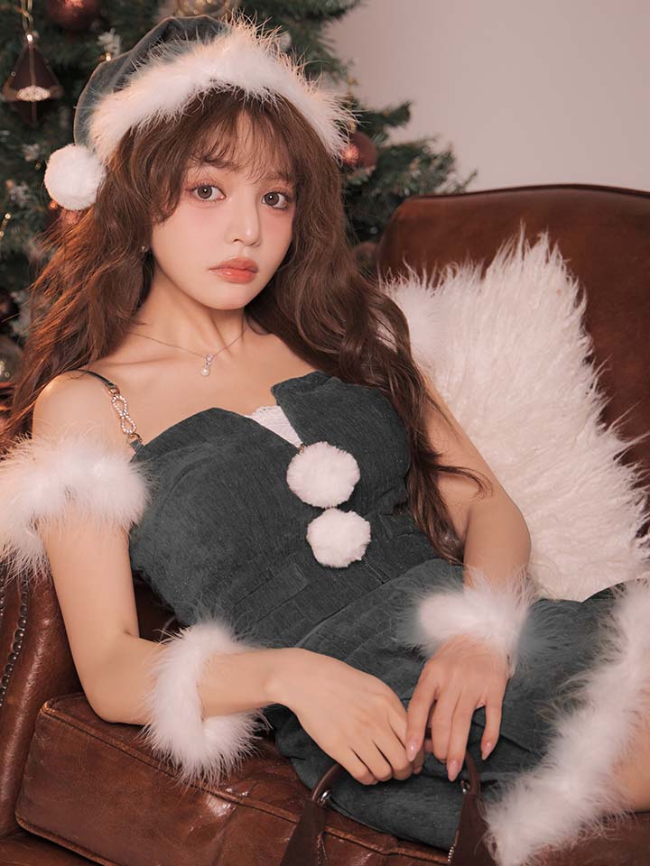 肩やスカート、袖口にあしらったホワイトファーディテールが、