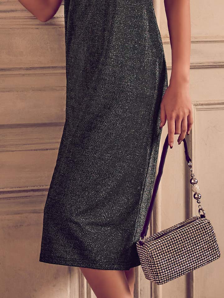 キラキラのラメ生地と品ある露出感のデザインが優雅な雰囲気で満ちる大人ミディアムワンピース。