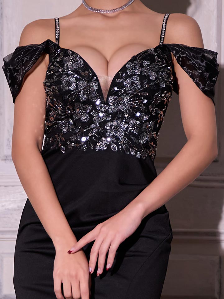 ブラックカラーのに華麗なフラワー刺繍が女王感を感じさせる大人セクシーロングドレス。
