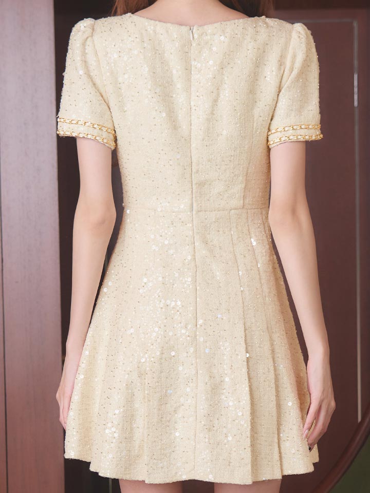 プリーツスカートとゴールドの装飾で華やかに。