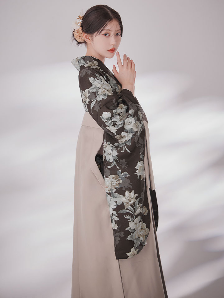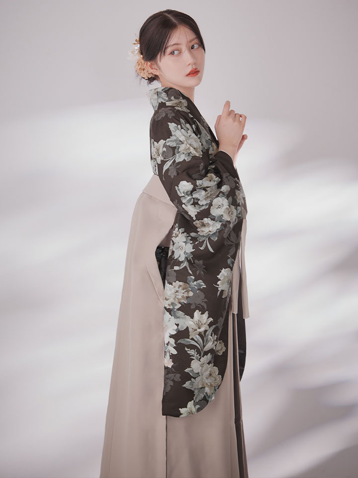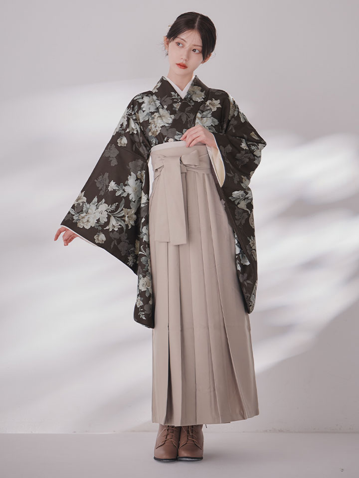 【予約商品/1月中旬発送】ベージュ小花 ブラウン二尺袖着物【卒業袴3点セット 二尺袖着物/帯/袴】 [HR-106-ok-BR-F-25EN-251220]
