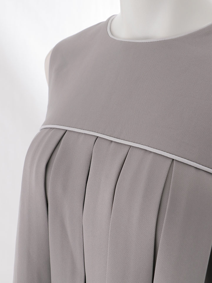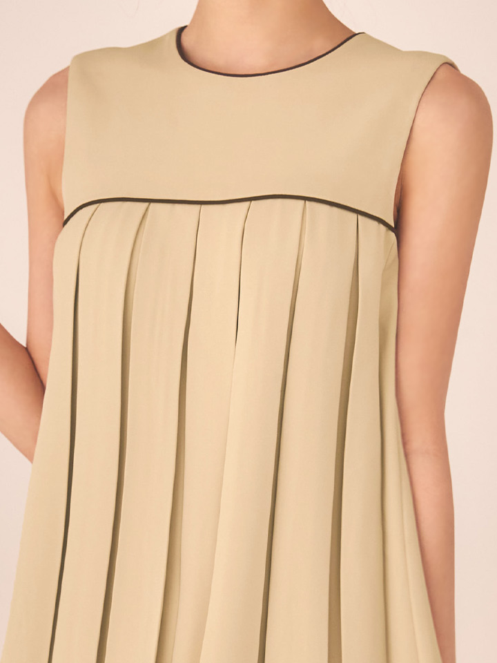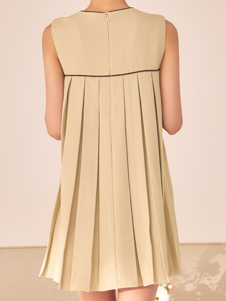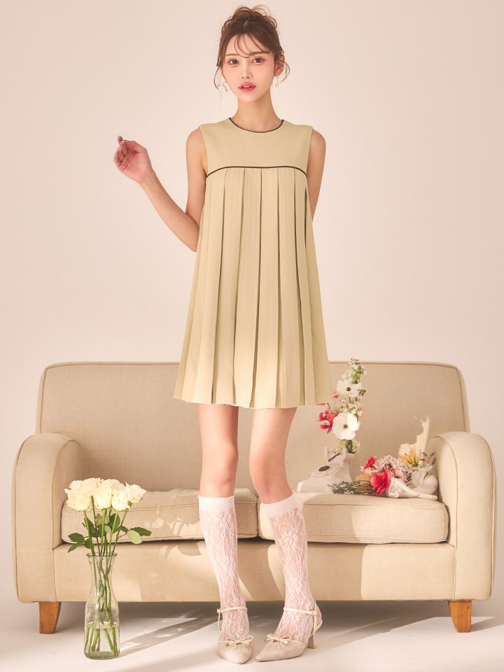 揺れるプリーツに視線釘付け。パイピングがアクセントのAラインミニドレス。