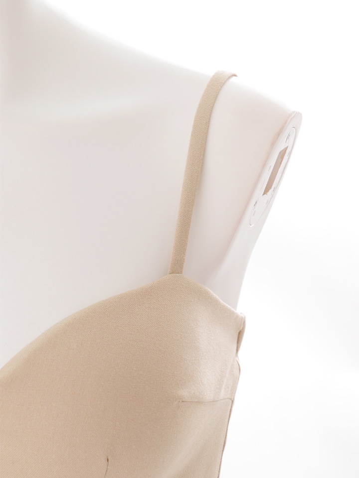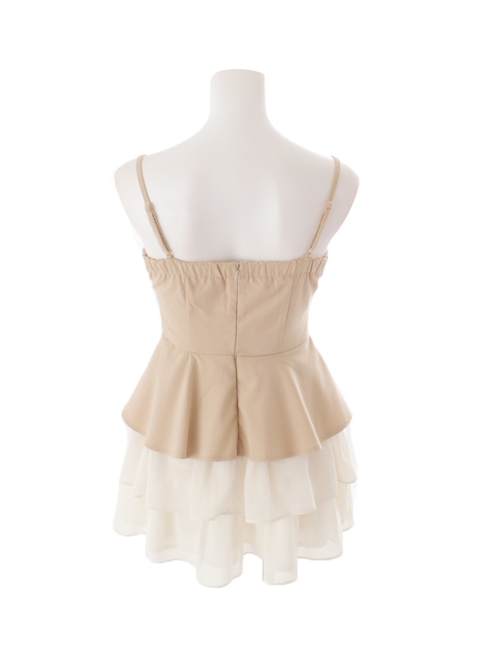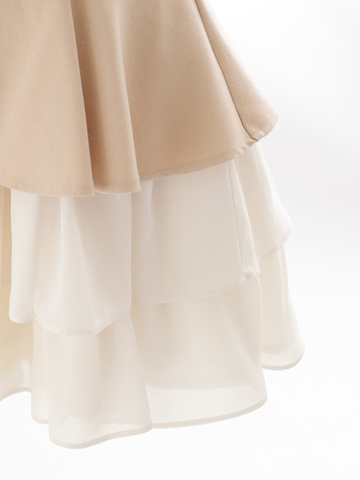 キャミソールでスッキリとした上半身に対して、裾のフリルがふんわりと揺れ、華やかな存在感を演出します。