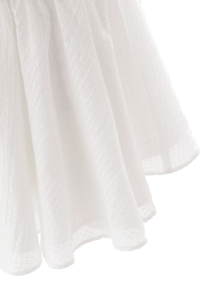 ふんわり広がるフレアスカートとのコントラストで、メリハリのある「砂時計ライン」を際立たせます。