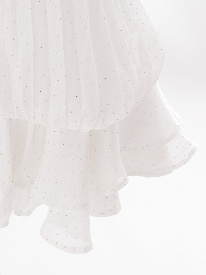甘いディテールをモードな形に落とし込んだ、感度の高いお姉さんのための主役級ドレスです。