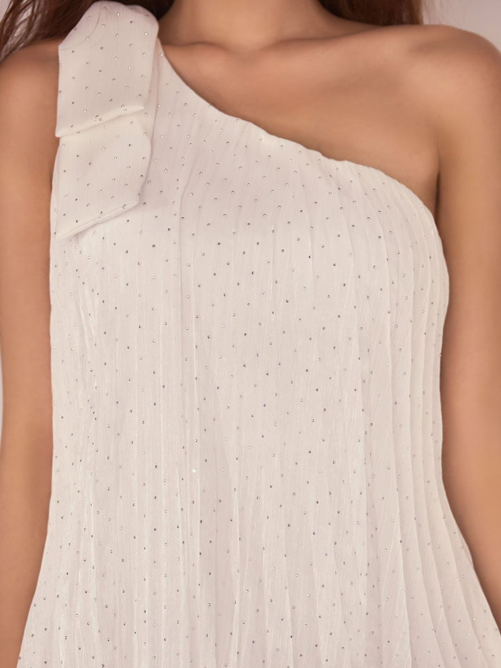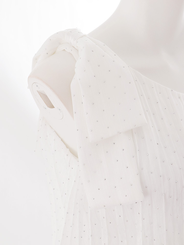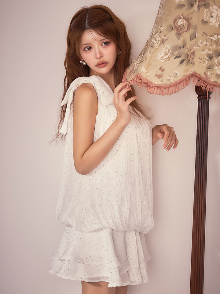 大胆なワンショルダーにあしらわれた大きな肩リボンが、顔まわりを華やかに、そして「あざとく」彩ります。