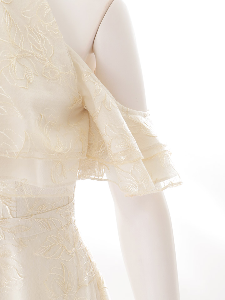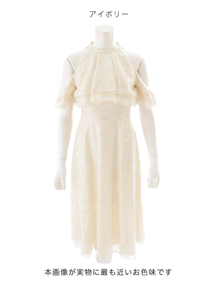立体的な2段フリルが胸元にボリュームをプラスし、ウエストとのメリハリを強調してスタイルアップ。