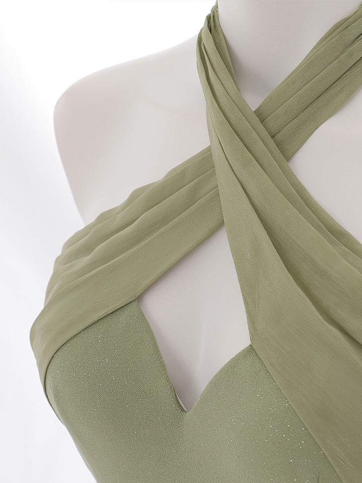ホルターネックの大胆なカットがデコルテを美しく魅せ、女性らしい抜け感を演出します。