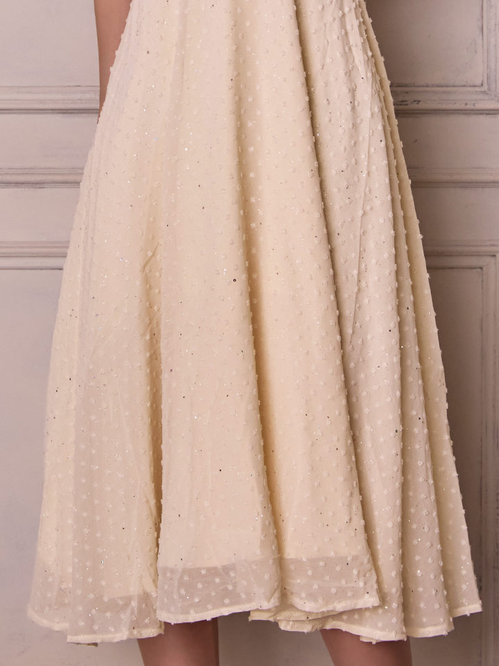キラキラしたデザイン性あるシフォン生地が織りなすオシャレな雰囲気が魅力的なワンピースドレス。