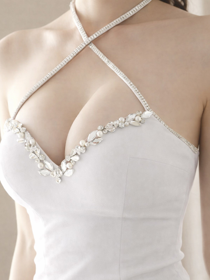胸元のクロスデザインがデコルテを美しく強調し、女性らしい魅力を引き立てます。